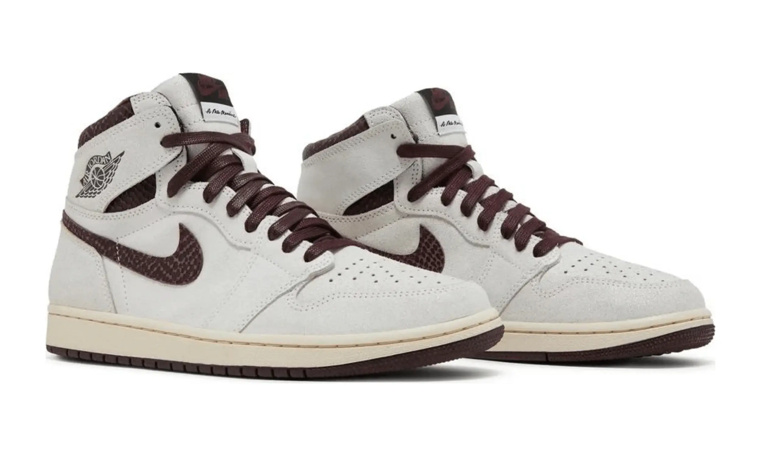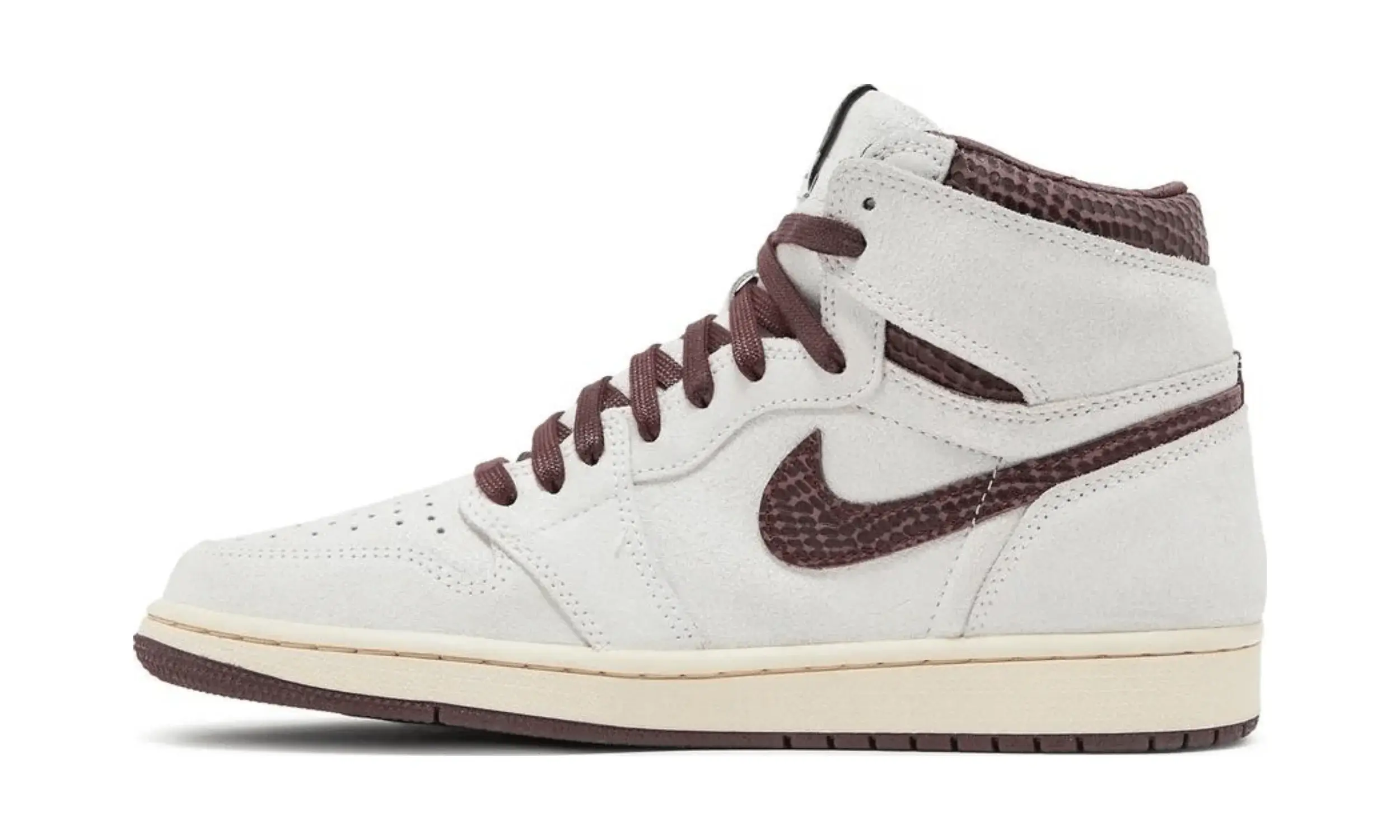 Cholewka butów Air Jordan 1 High A Ma Maniére wykonana jest z luksusowego, teksturowanego zamszu w kolorze złamanej bieli. Na tym tle wyróżniają się bordowe akcenty — przede wszystkim logo Swoosh i kołnierz, które wykonane są z materiału imitującego skórę węża. Detale w modelu Air Jordan 1 High A Ma Maniére są dopracowane w każdym calu.