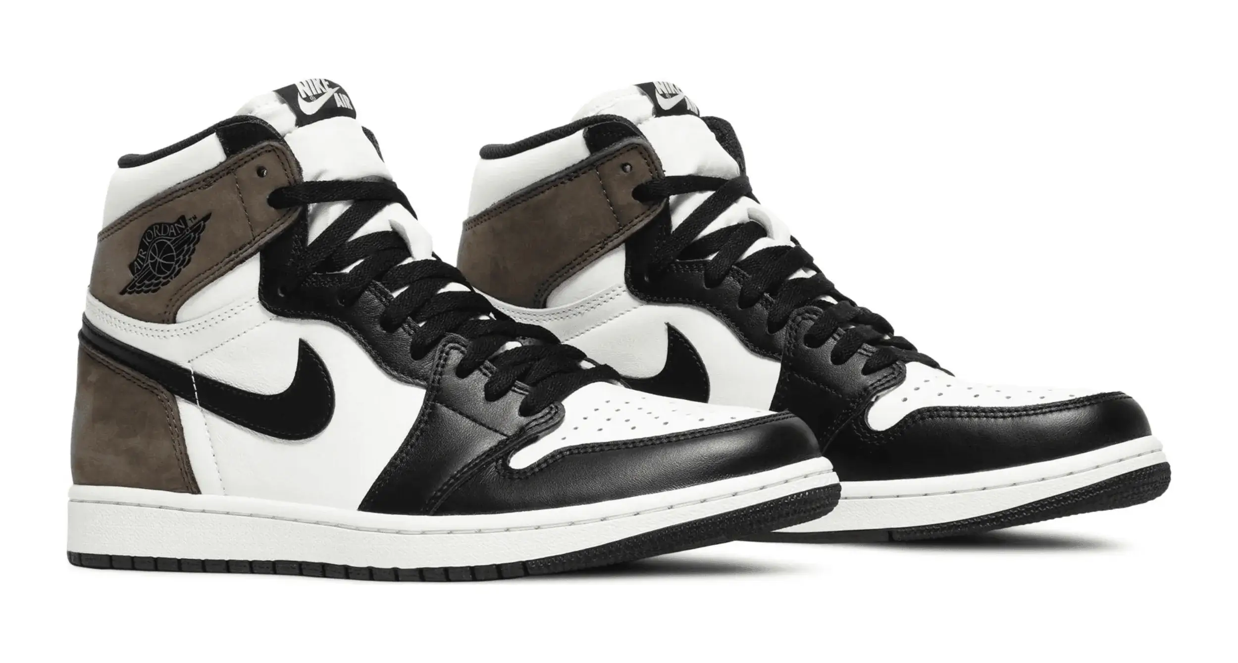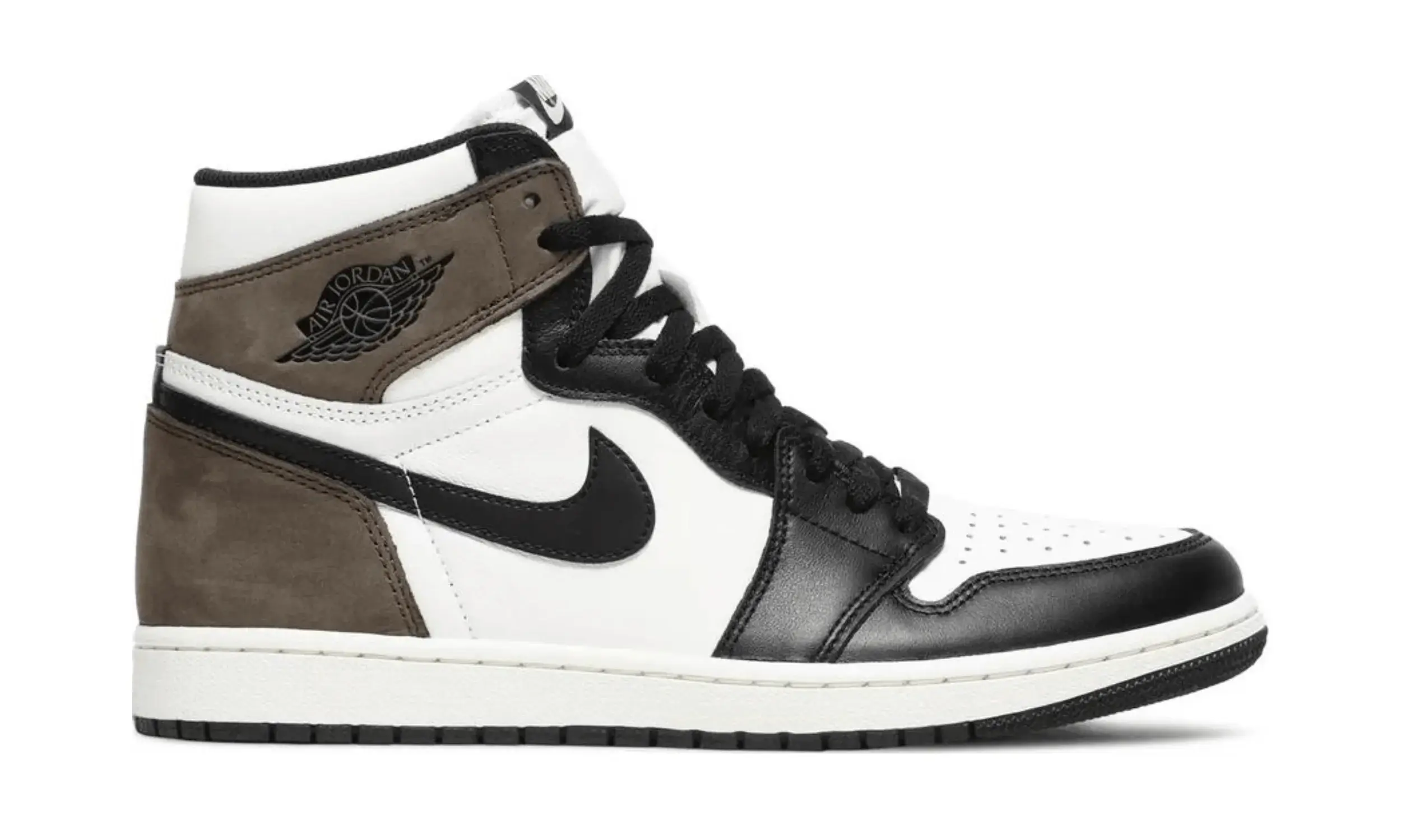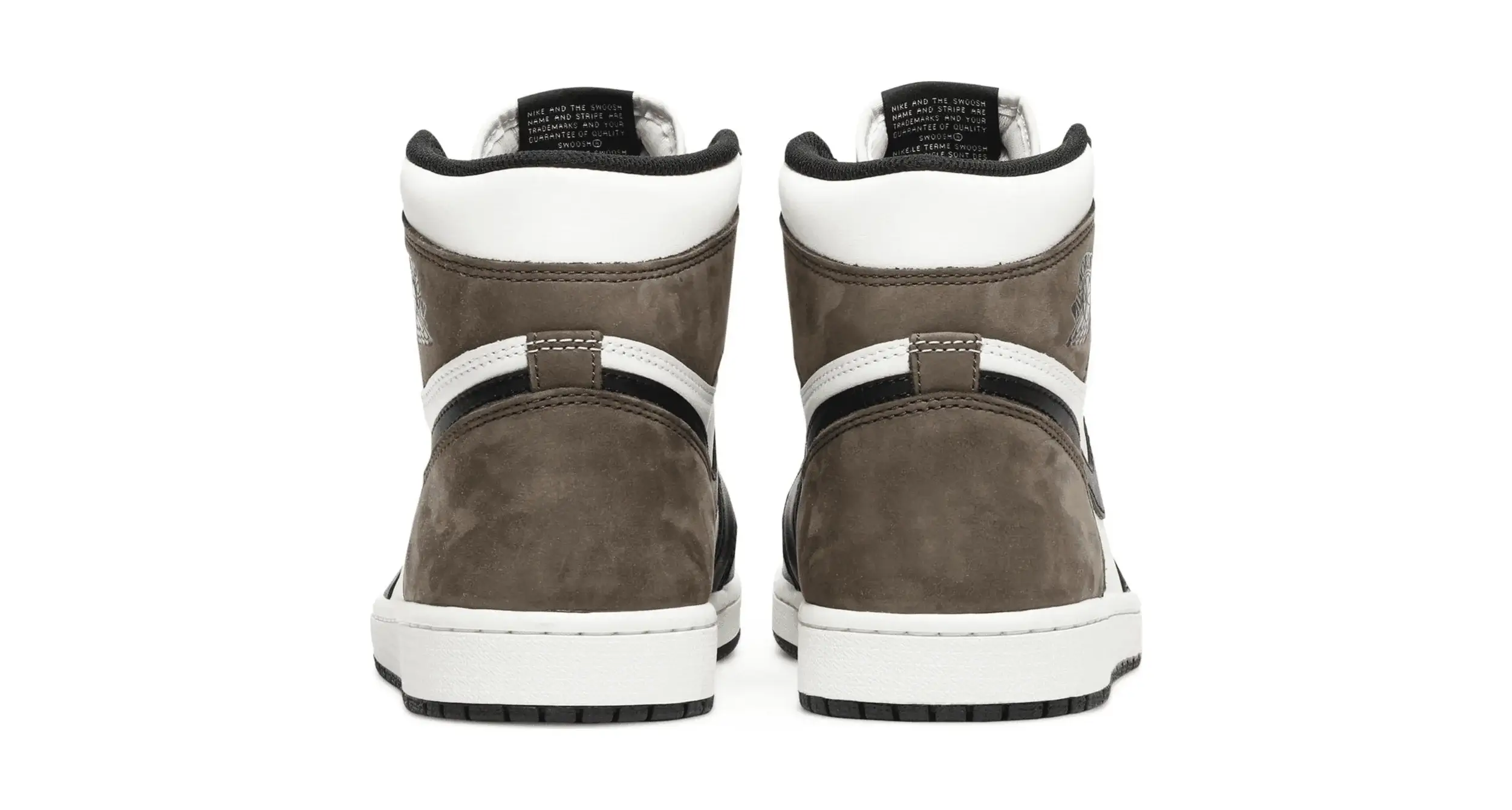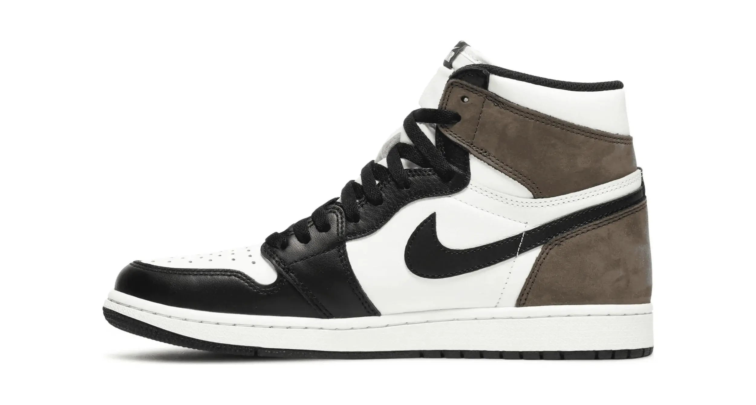 Cholewka butów Air Jordan 1 High Dark Mocha wykonana jest z wysokiej jakości skóry w kolorze złamanej bieli, która pokrywa perforowany toebox, boczne panele oraz kołnierz. Elementy w okolicach wiązania, obudowa noska oraz charakterystyczny Swoosh są z czarnej skóry. Tylny panel i kołnierz zdobi brązowy nubuk.