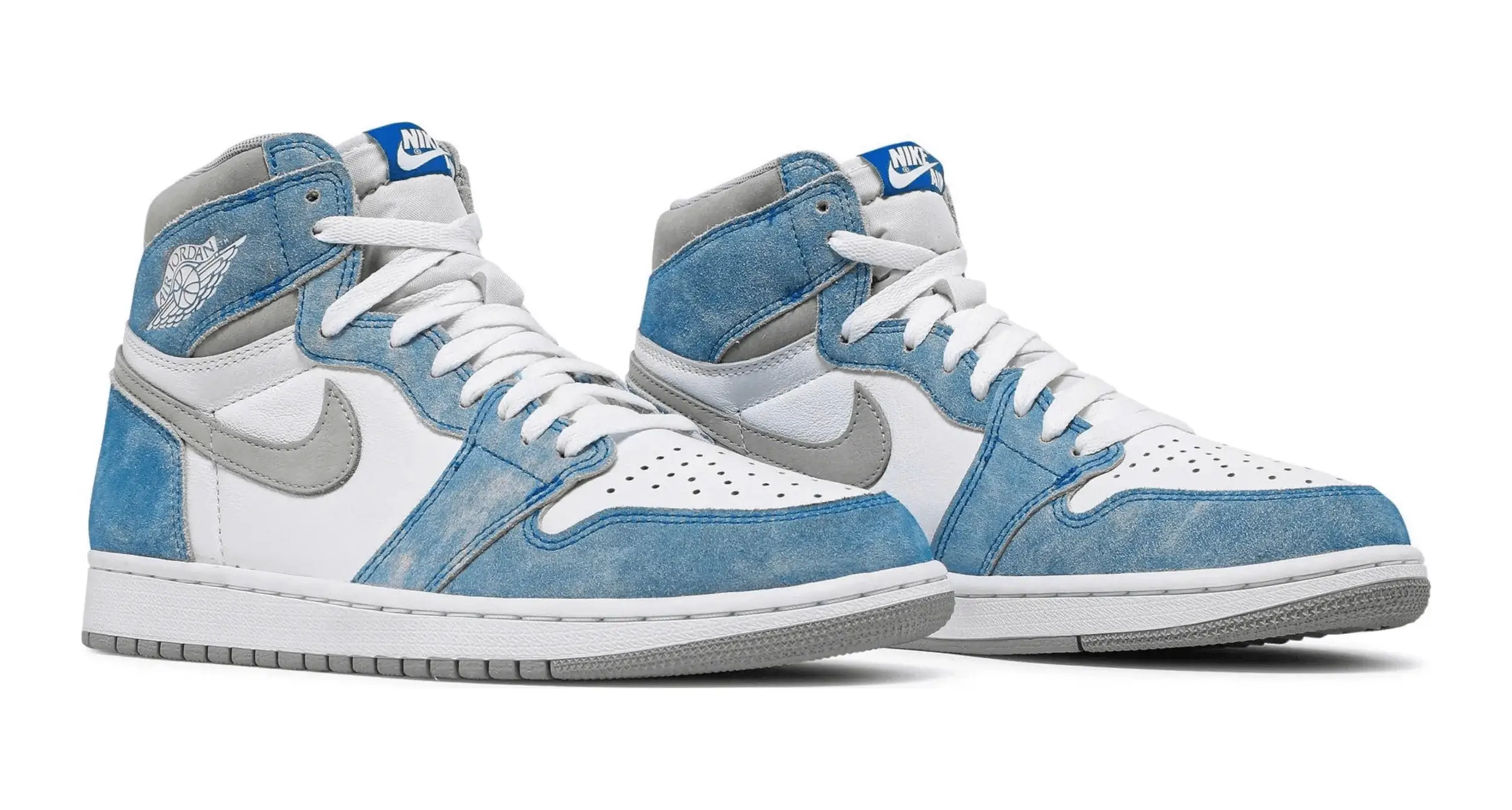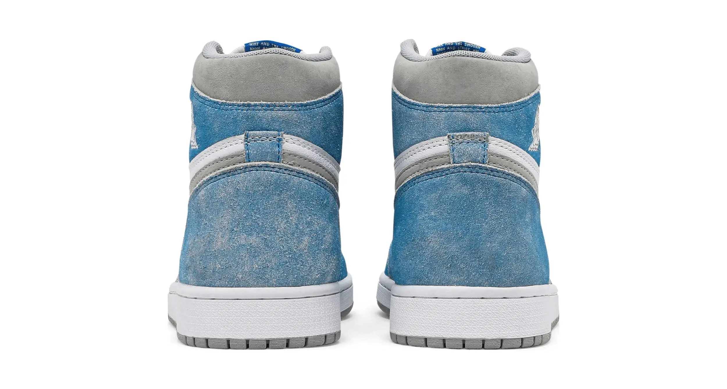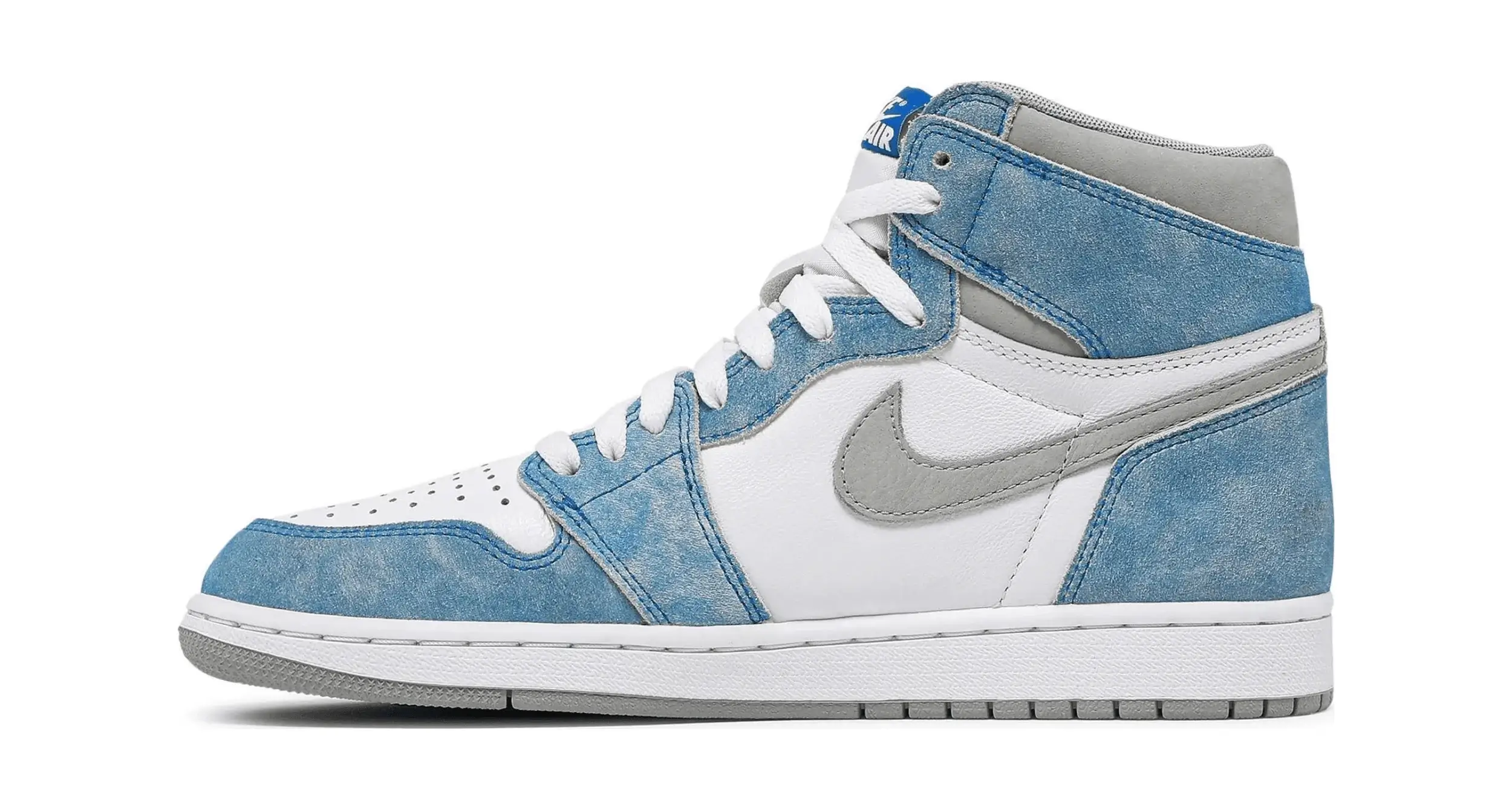 Cholewka modelu Air Jordan 1 High Hyper Royal wykonana jest z gładkiej białej skóry, która stanowi bazę dla wyblakłych, niebieskich zamszowych nakładek. Dodatkowo boczne szare logo Swoosh i kołnierz z zamszu tworzą subtelny kontrast.