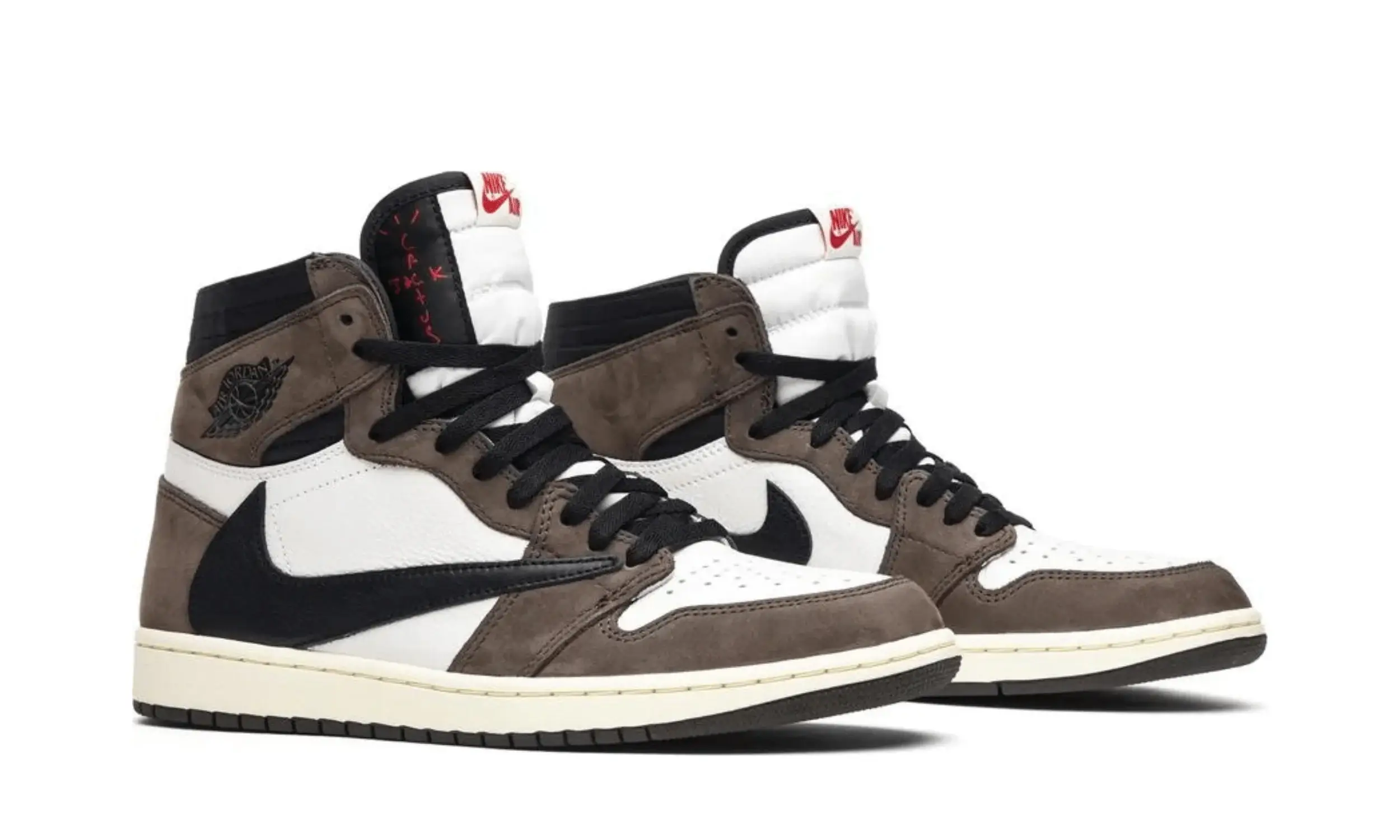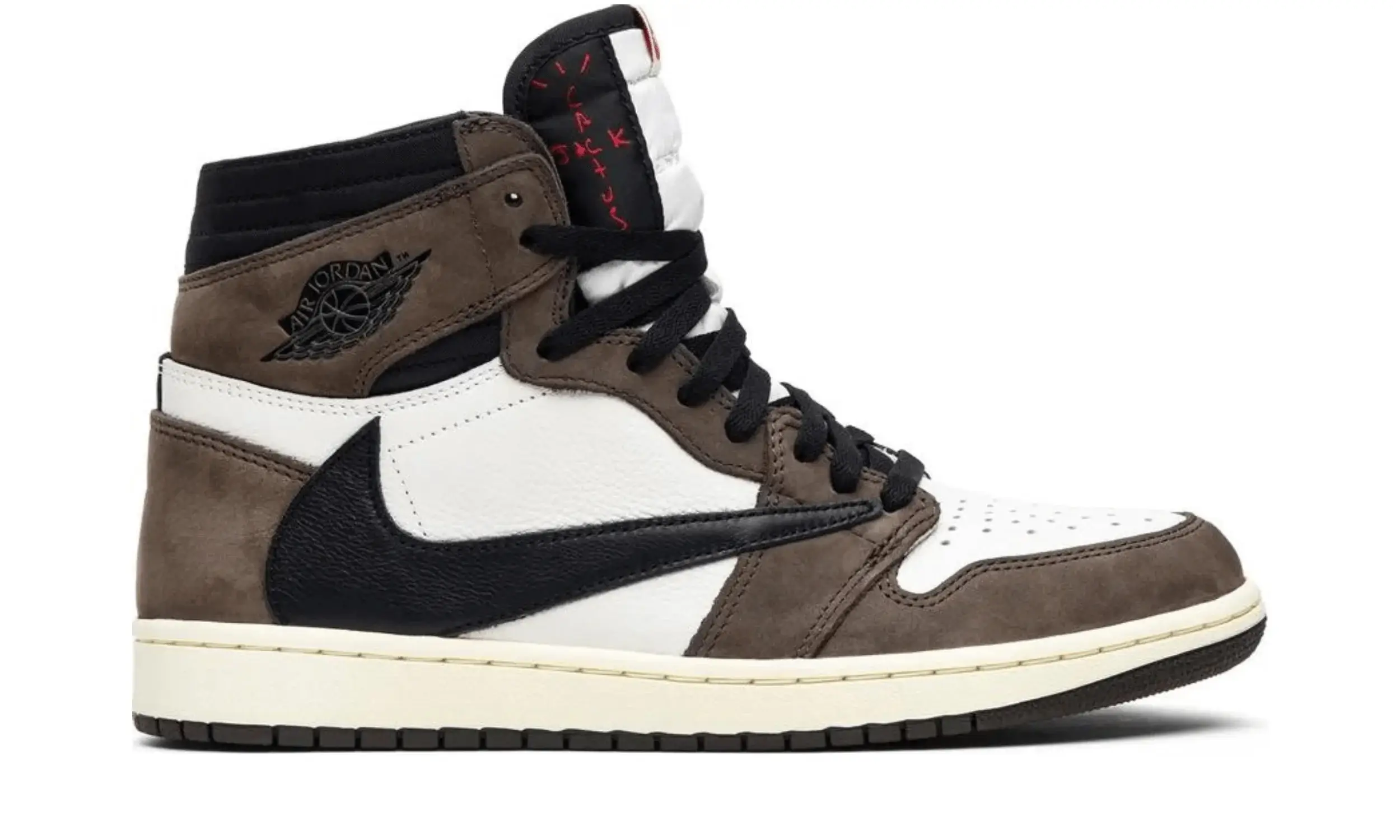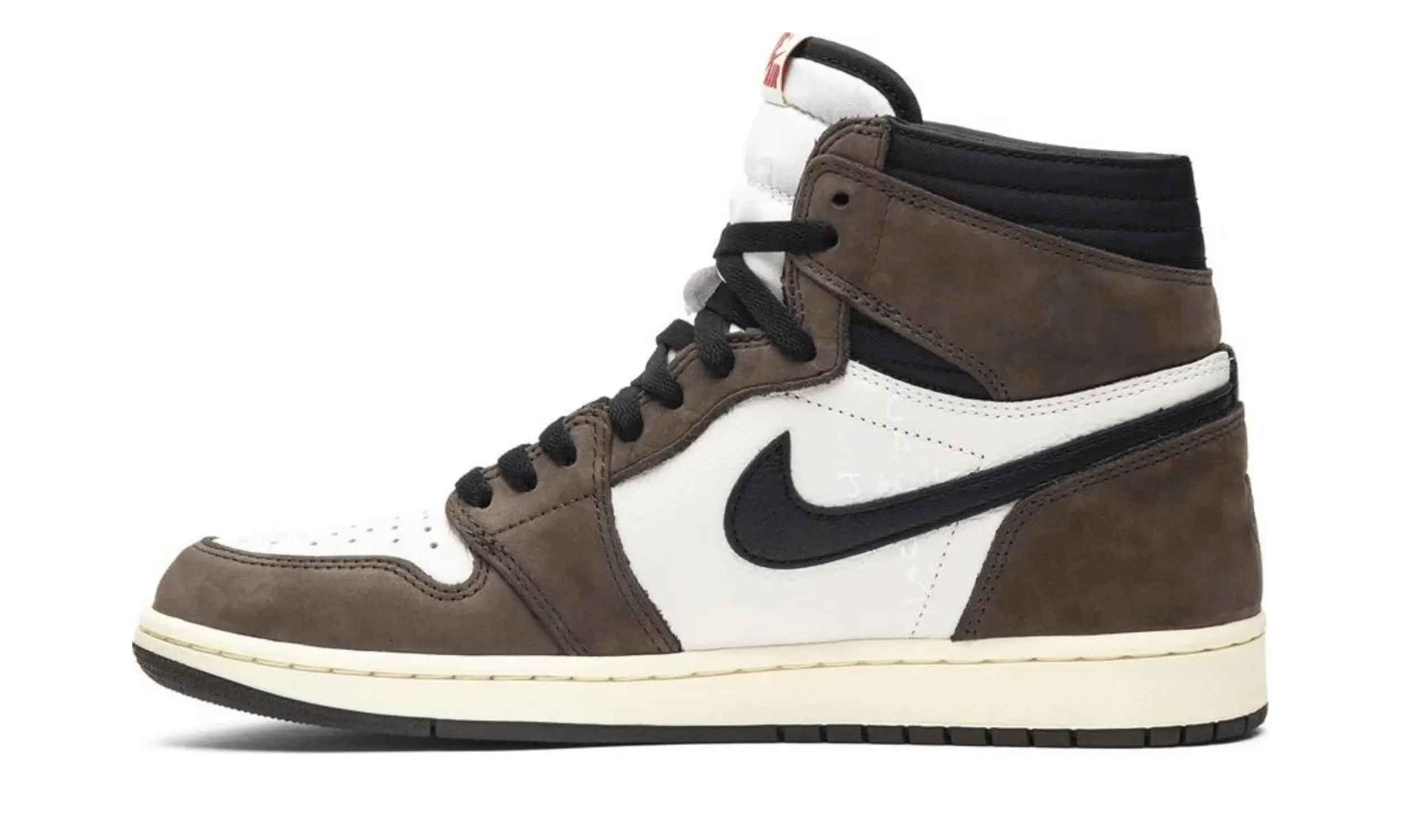 Buty Air Jordan 1 High OG SP Travis Scott to efekt kolaboracji marki Air Jordan z młodym raperem z Houston — Travisem Scottem. Sneakersy charakteryzują się doskonałym połączeniem białej skóry i brązowego zamszu. Na uwagę zasługuje również charakterystyczne czarne, odwrócone logo Swoosh na cholewce, wykonane z czarnej skóry.
