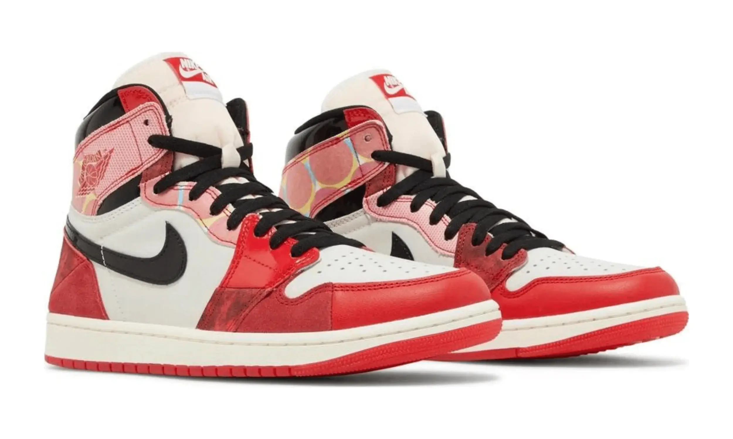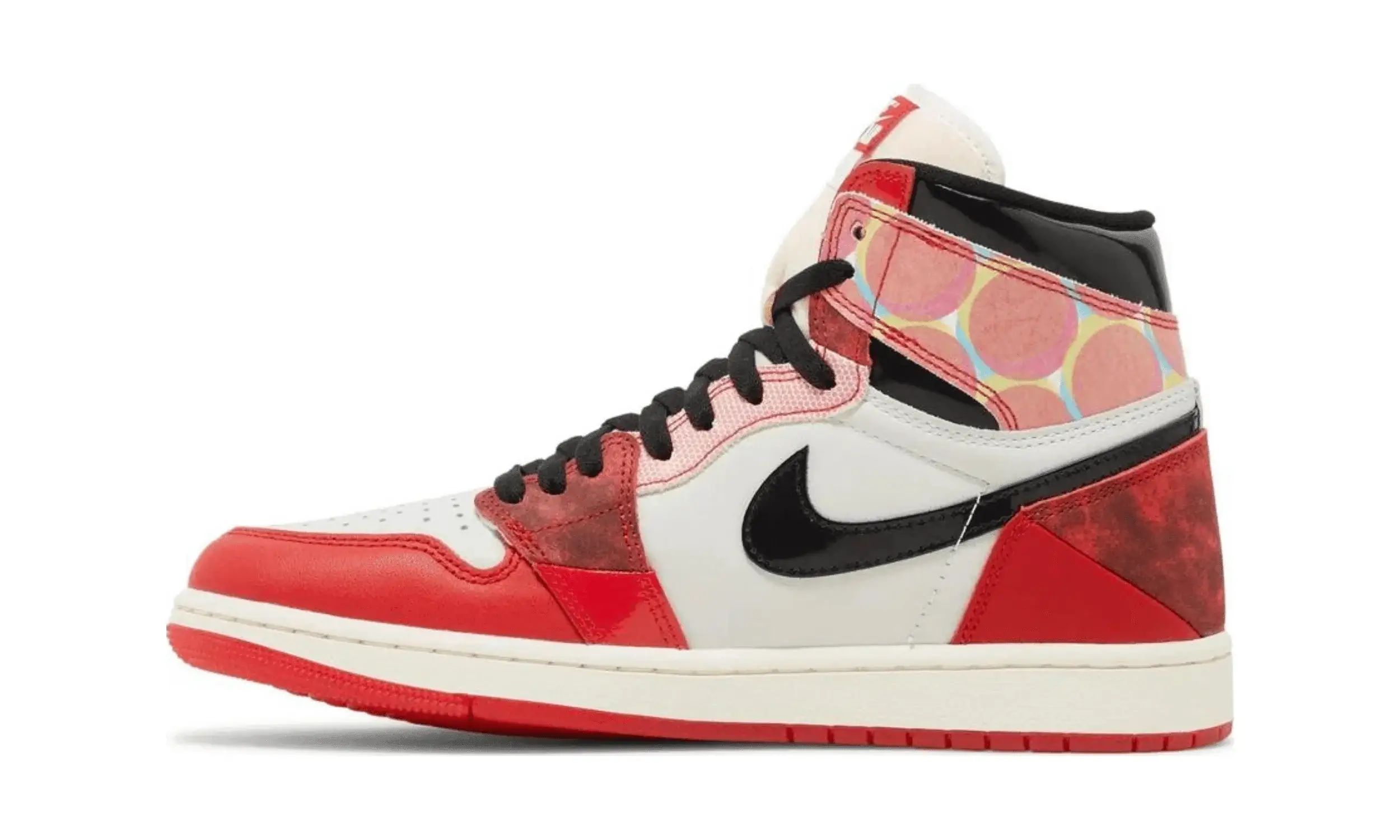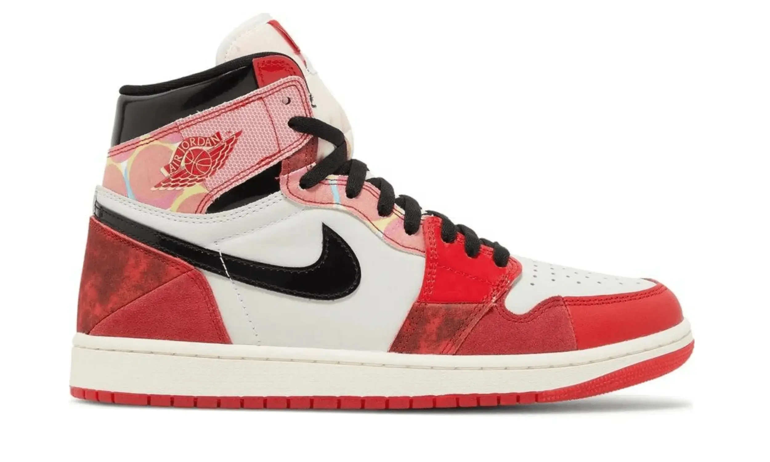 Model Air Jordan 1 High OG „Spider-Man: Across the Spider-Verse” to wyjątkowa edycja inspirowana najnowszym filmem animowanym o przygodach Spider-Mana. Wzornictwo nawiązuje do klasycznej kolorystyki „Chicago”, łącząc ją z estetyką rodem z komiksów. Cholewka buta wykonana jest z białej skóry, na której umieszczono dynamiczne, czerwone panele oraz czarne, lakierowane elementy na kołnierzu i logo Swoosh.