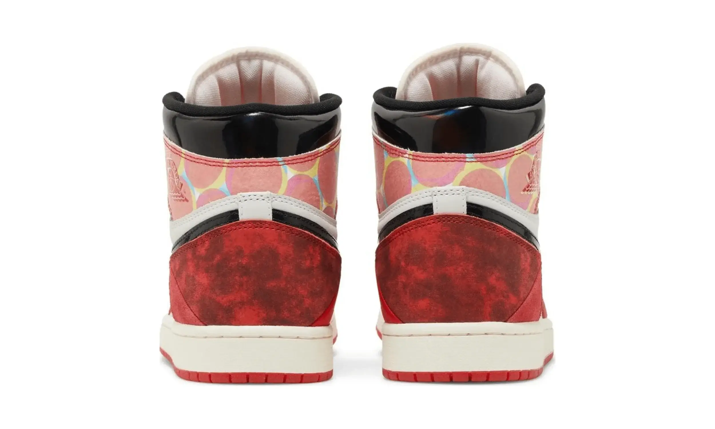 Czerwone nakładki tworzą patchworkową mieszankę różnych tekstur i nadruków, co symbolizuje wielowymiarowy wszechświat Spider-Mana. Geometria tych wzorów oddaje ruch i dynamikę animacji z filmu „Spider-Man: Across the Spider-Verse”. Dodatkowe detale to wytłoczone logo Wings po boku kołnierza oraz tkana metka z napisem “NIKE AIR” na nylonowym języku.
