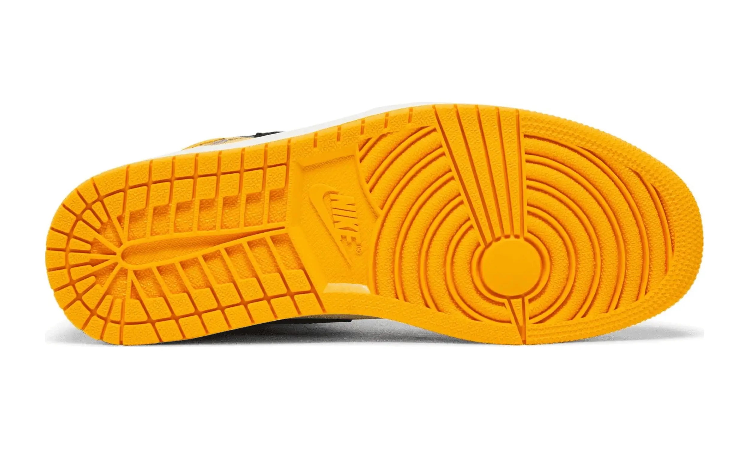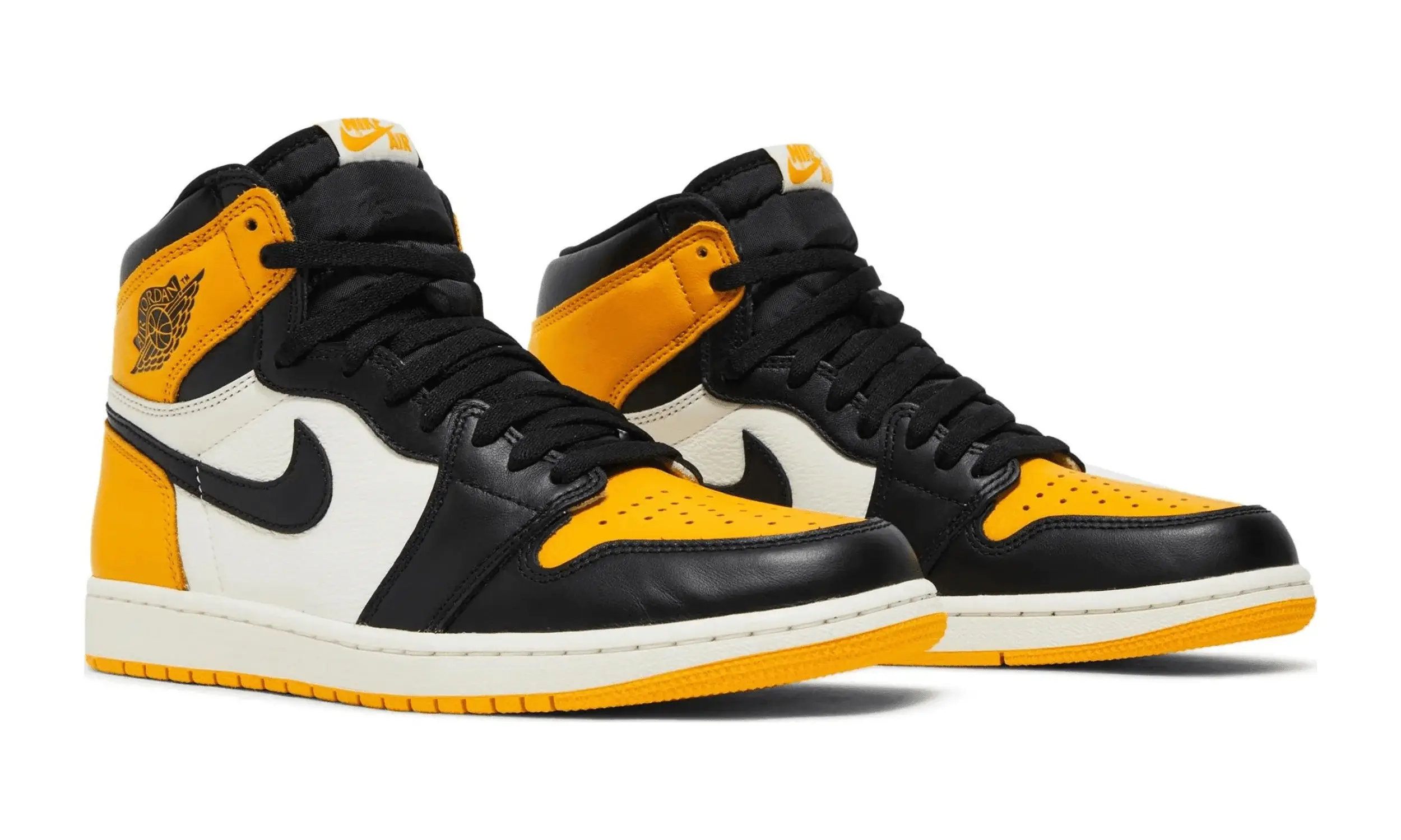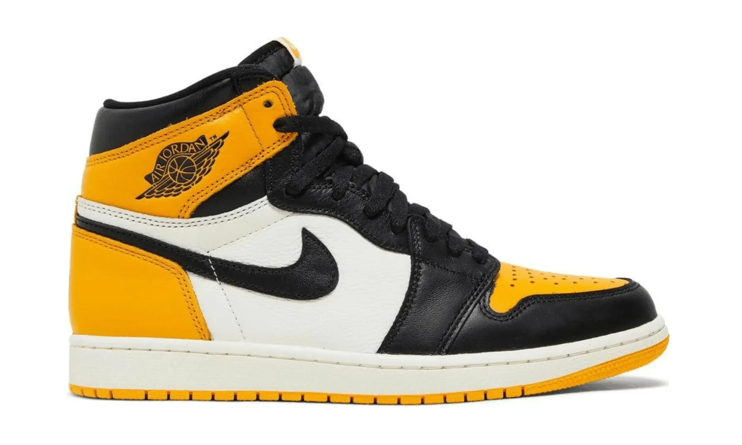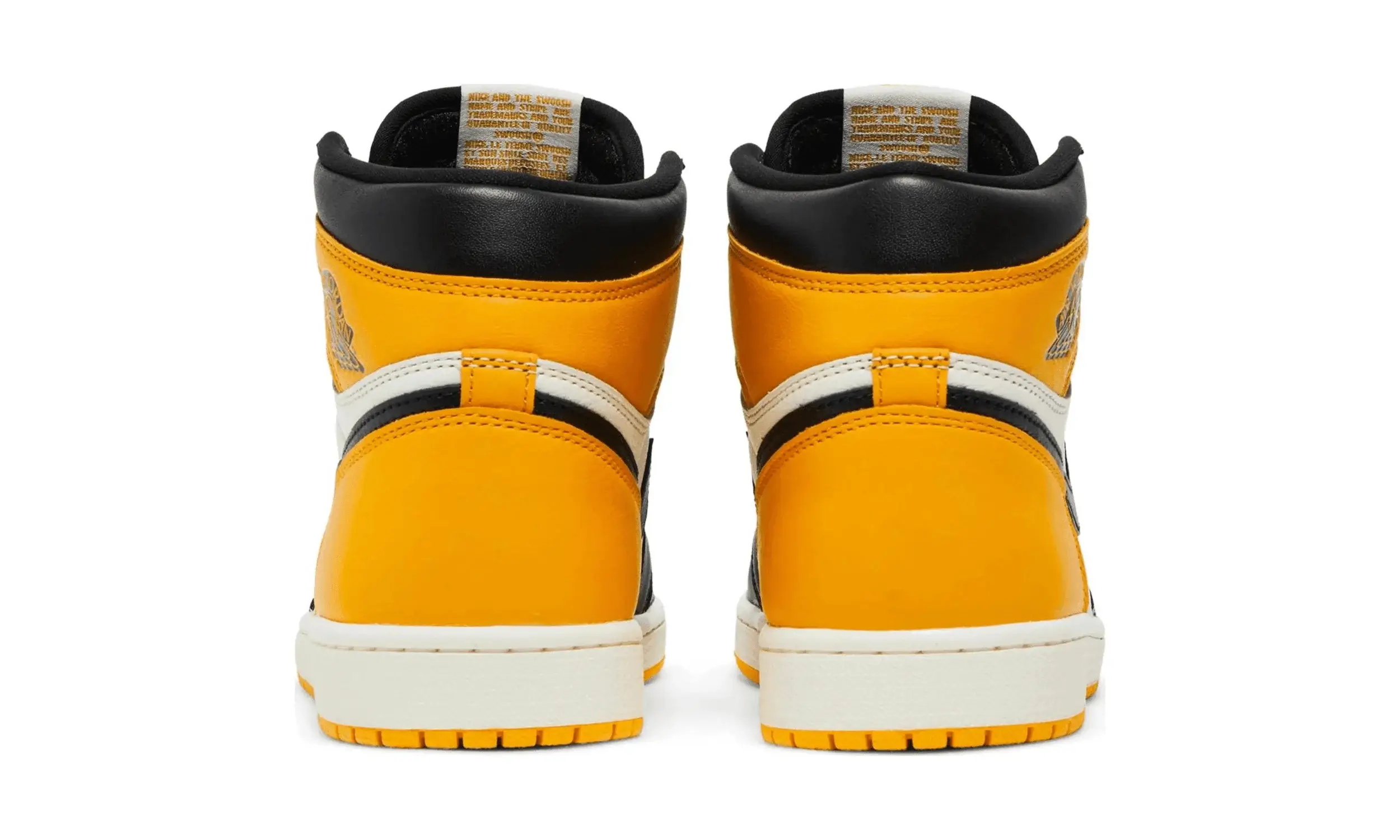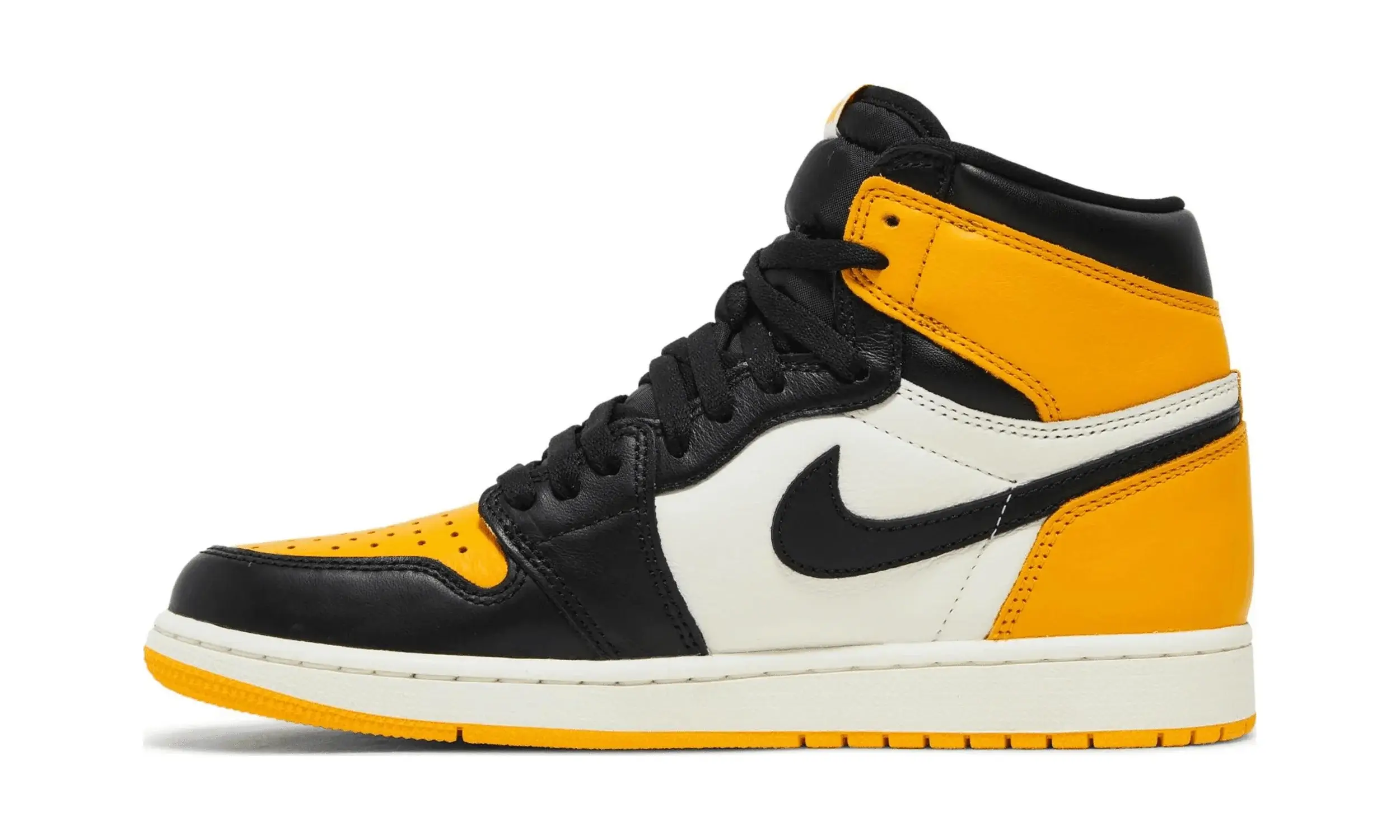 Cholewka modelu Air Jordan 1 High Taxi wykonana jest z wysokiej jakości skóry, łącząc białe panele boczne z żółtym noskiem i czarnymi nakładkami w przedniej części stopy. Czarny Swoosh i logotyp Wings wytłoczony na żółtej klapce kołnierza dodają elegancji. Bursztynowe akcenty pojawiają się na pięcie i kołnierzu, tworząc harmonijną całość.
