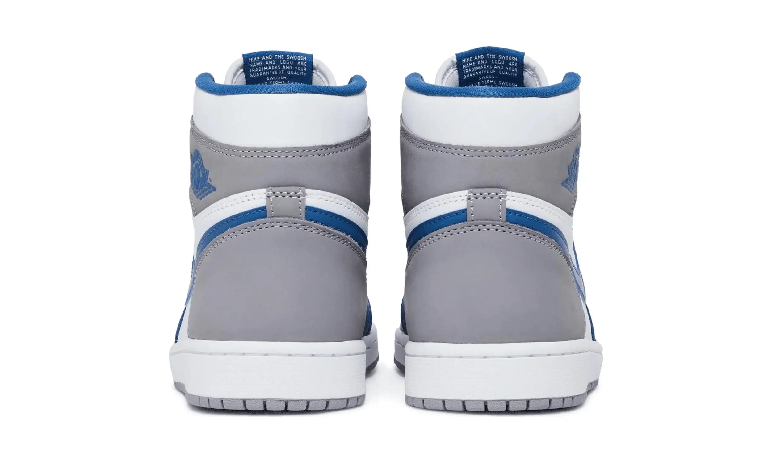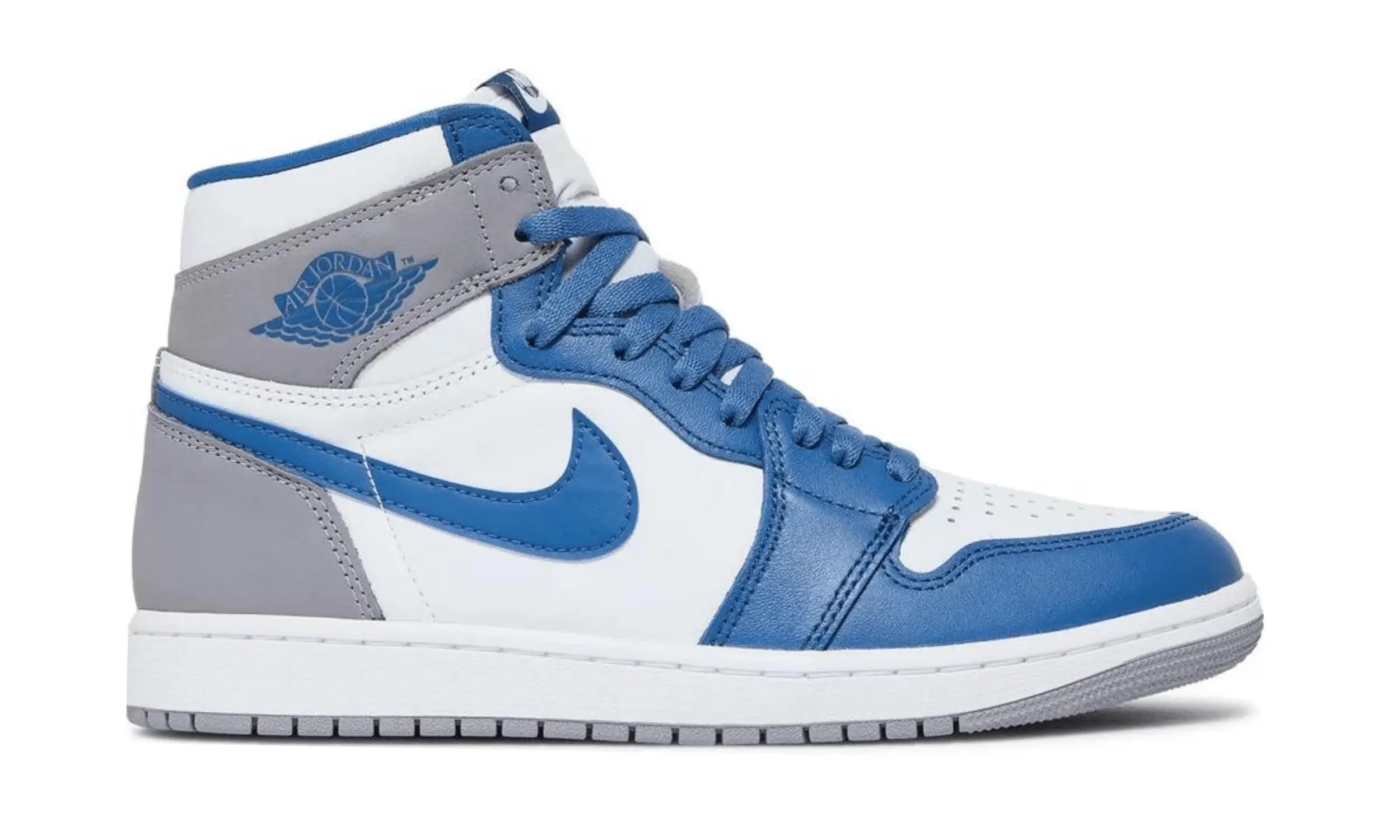 Cholewka butów Air Jordan 1 High True Blue wykonana jest z gładkiej białej skóry, która stanowi bazę dla kontrastujących elementów w kolorze True Blue. Niebieskie akcenty zdobią obudowę toeboxu, logotyp Swoosh oraz okolice wiązania. Dodatkowo niebieskie logo Wings na kołnierzu oraz tkana metka Nike Air na języku dodają wyrazistości.