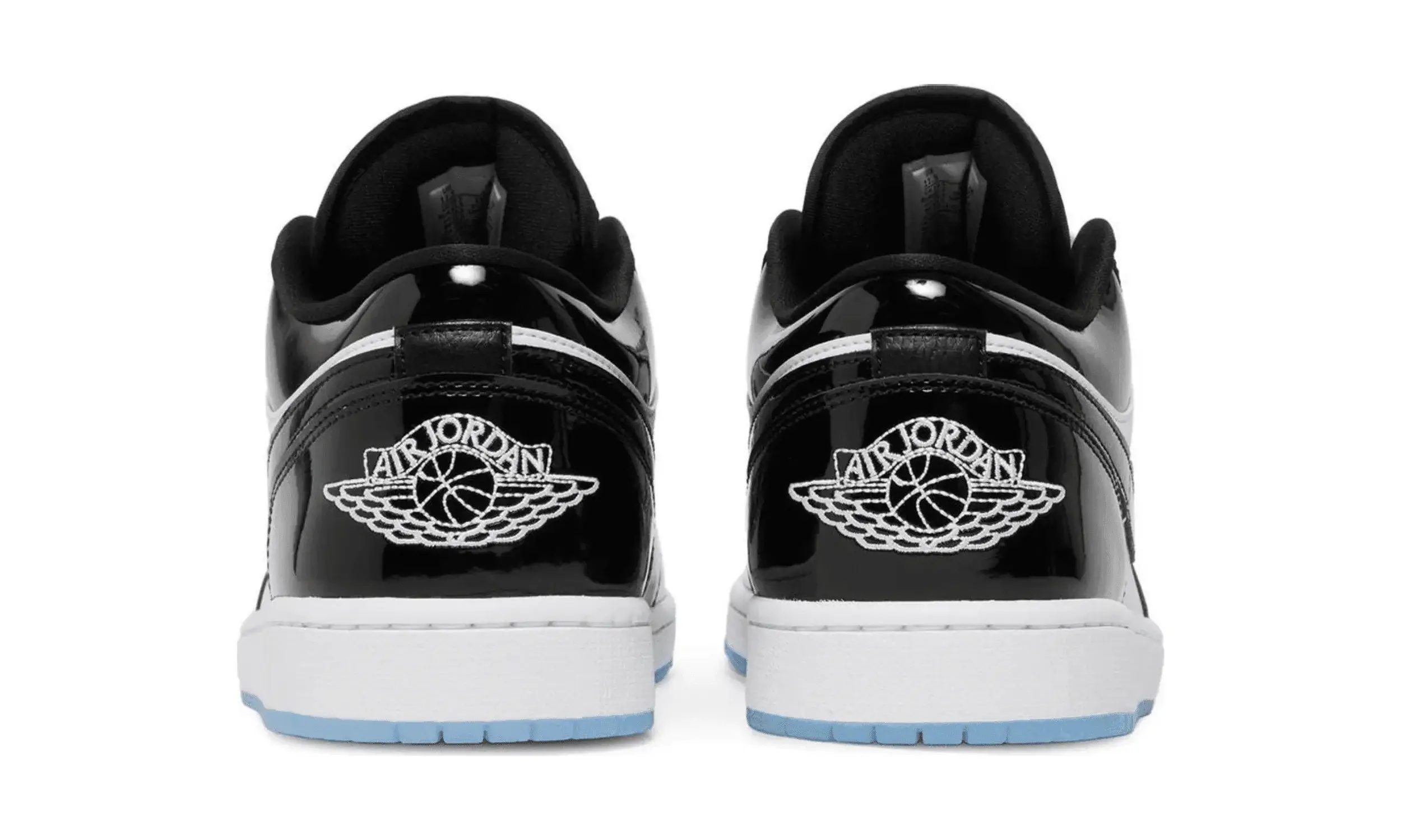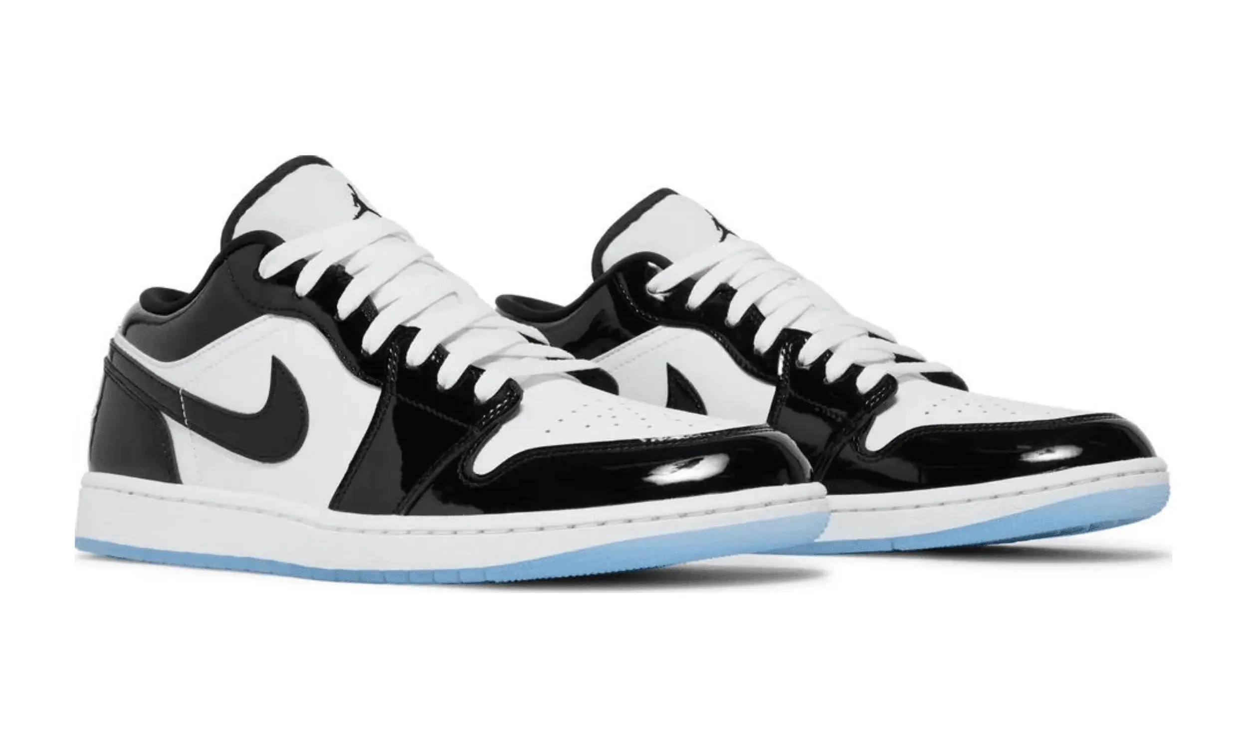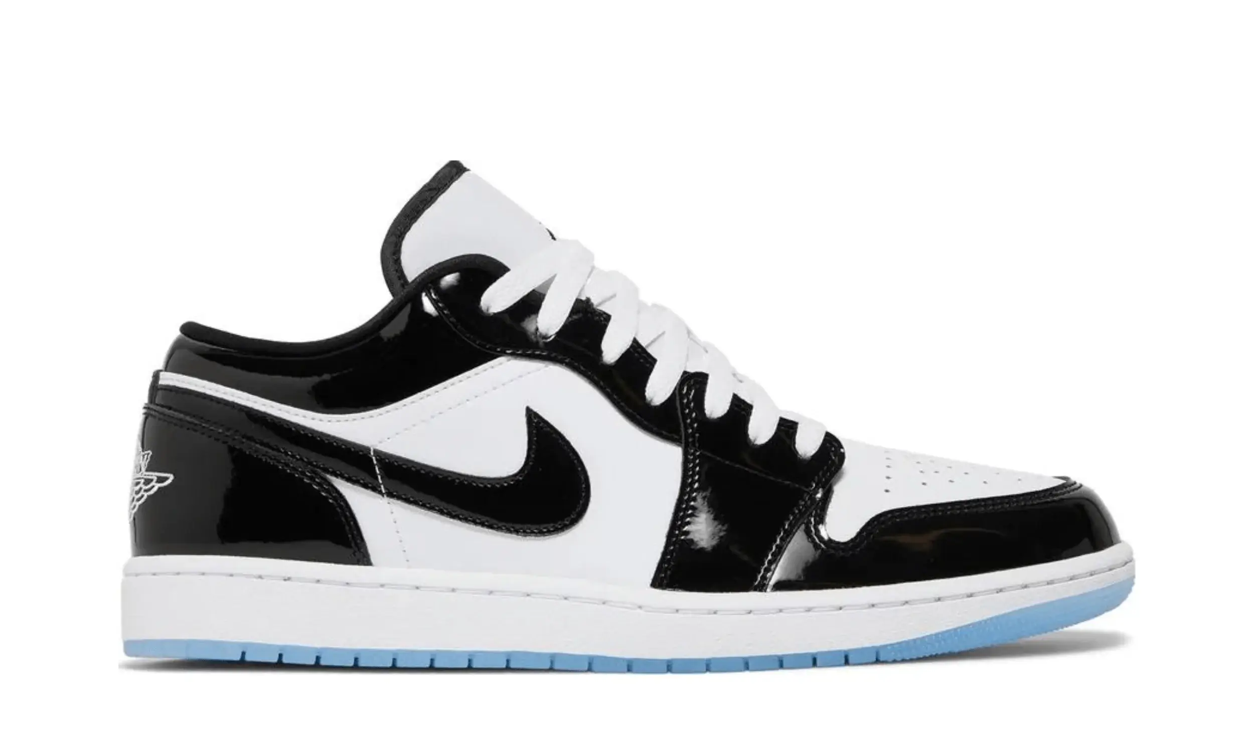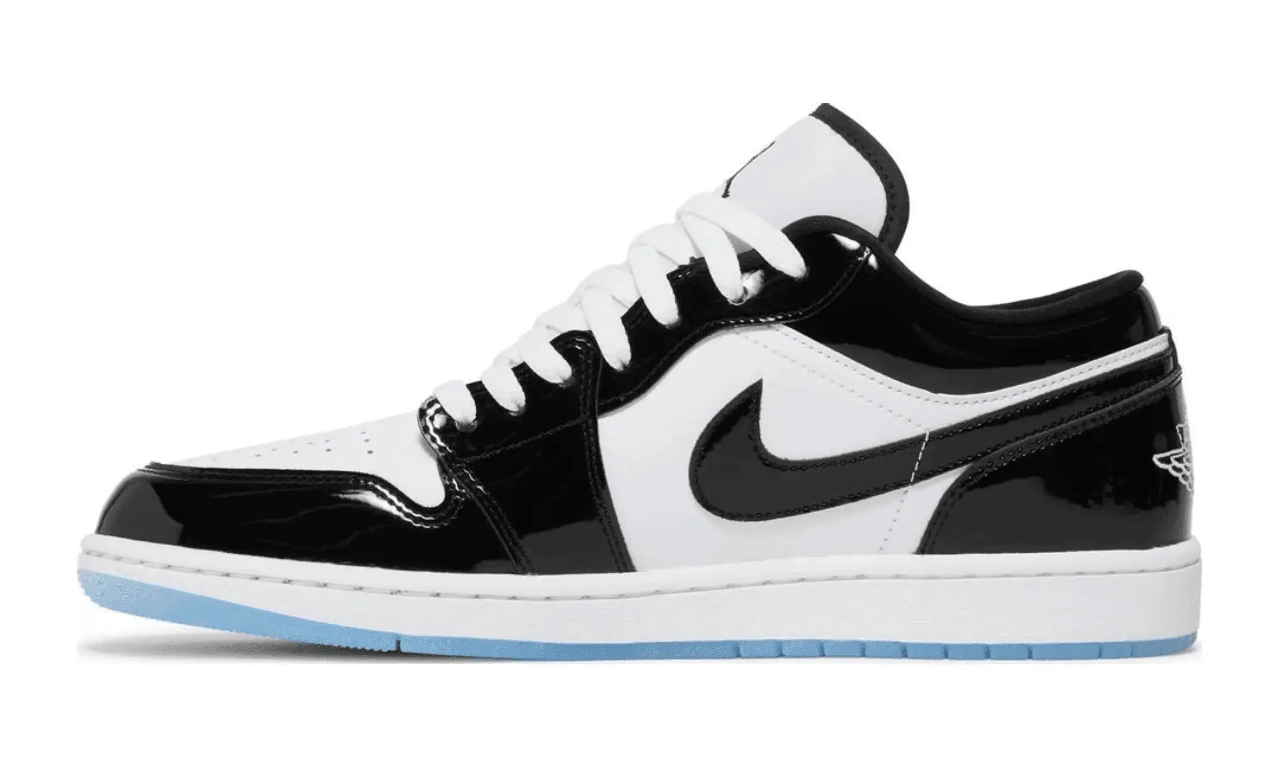 Buty Air Jordan 1 Low Concord są inspirowane kultowym modelem Air Jordan 11 Concord, wydanym w 2018 roku. Podstawą projektu jest biała skórzana cholewka, na której umieszczono czarne, lakierowane panele z połyskiem. Lakierowana skóra otacza piętę, toebox oraz oczka na sznurówki, tworząc harmonijną całość z czarną wyściółką.