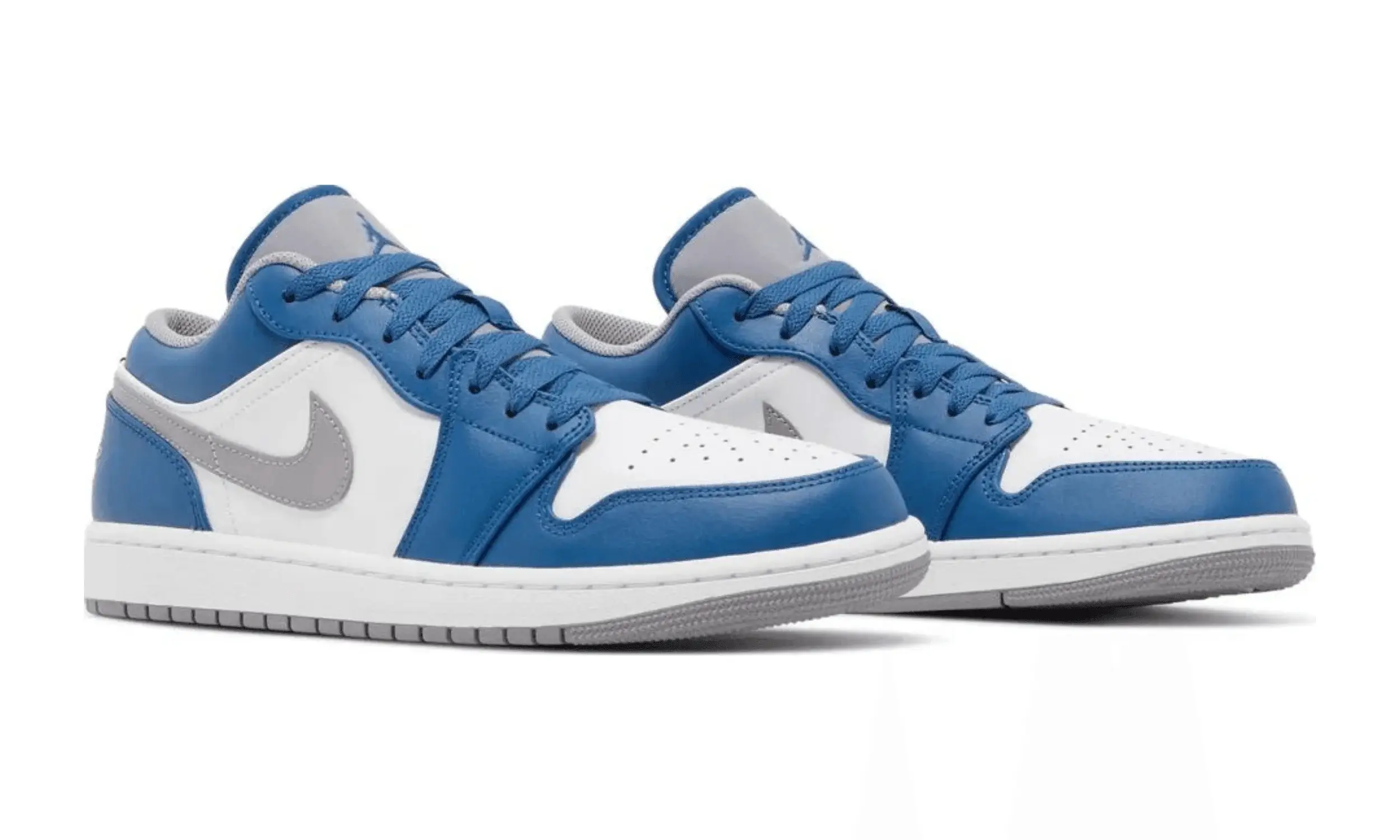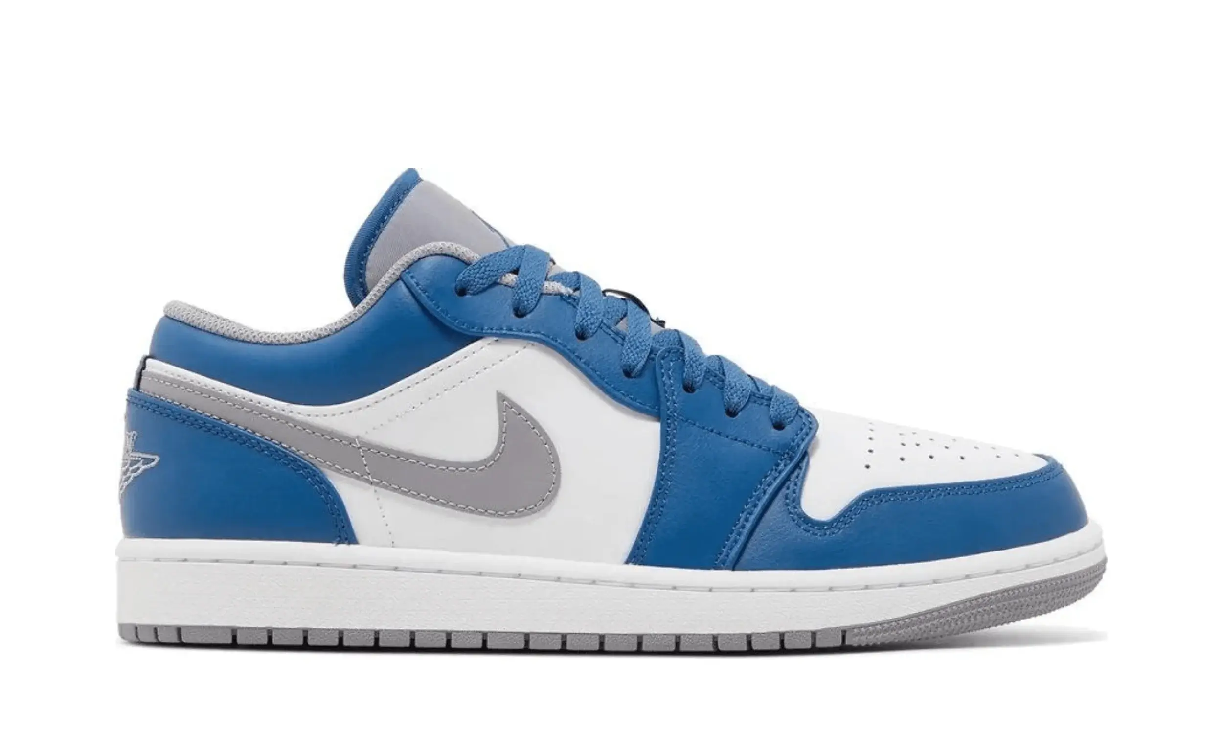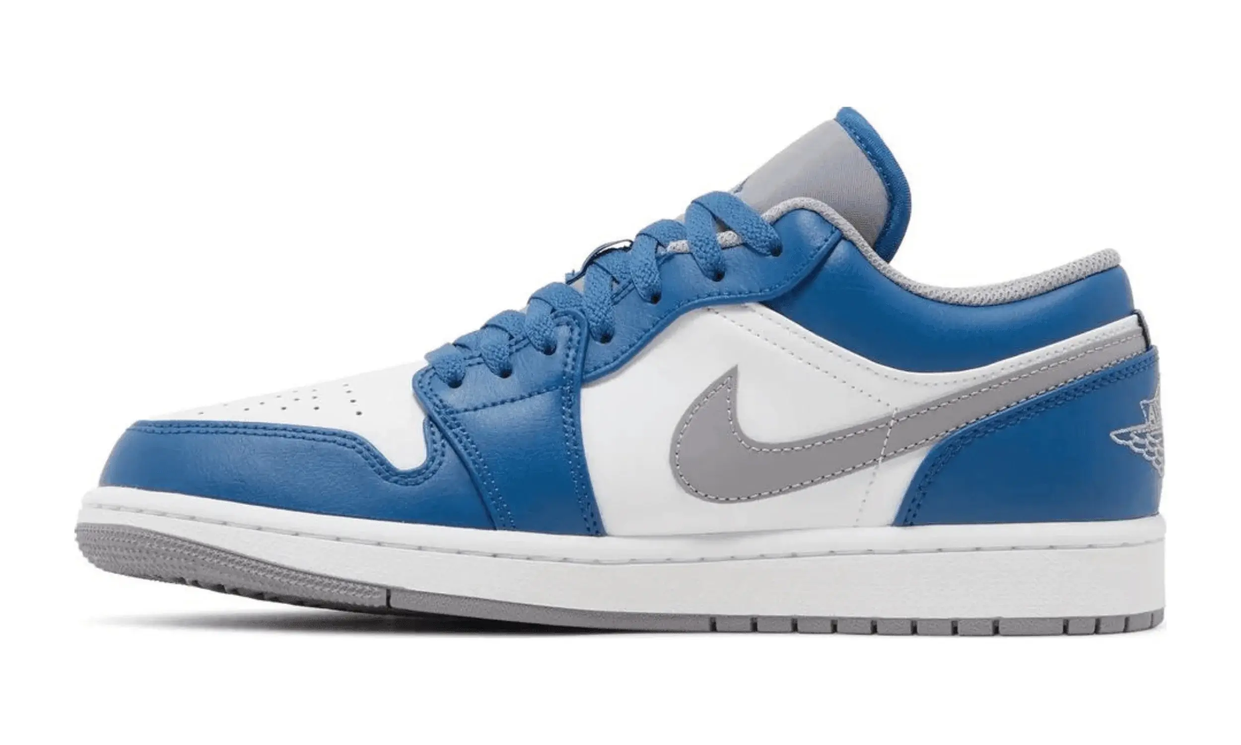 Cholewka butów Air Jordan 1 Low True Blue z białej skóry stanowi bazę, którą uzupełniają niebieskie, skórzane nakładki na przodzie, pięcie i kołnierzu. Perforowany biały toe box zapewnia przewiewność, a niebieskie sznurowadła dodają wyrazistości.