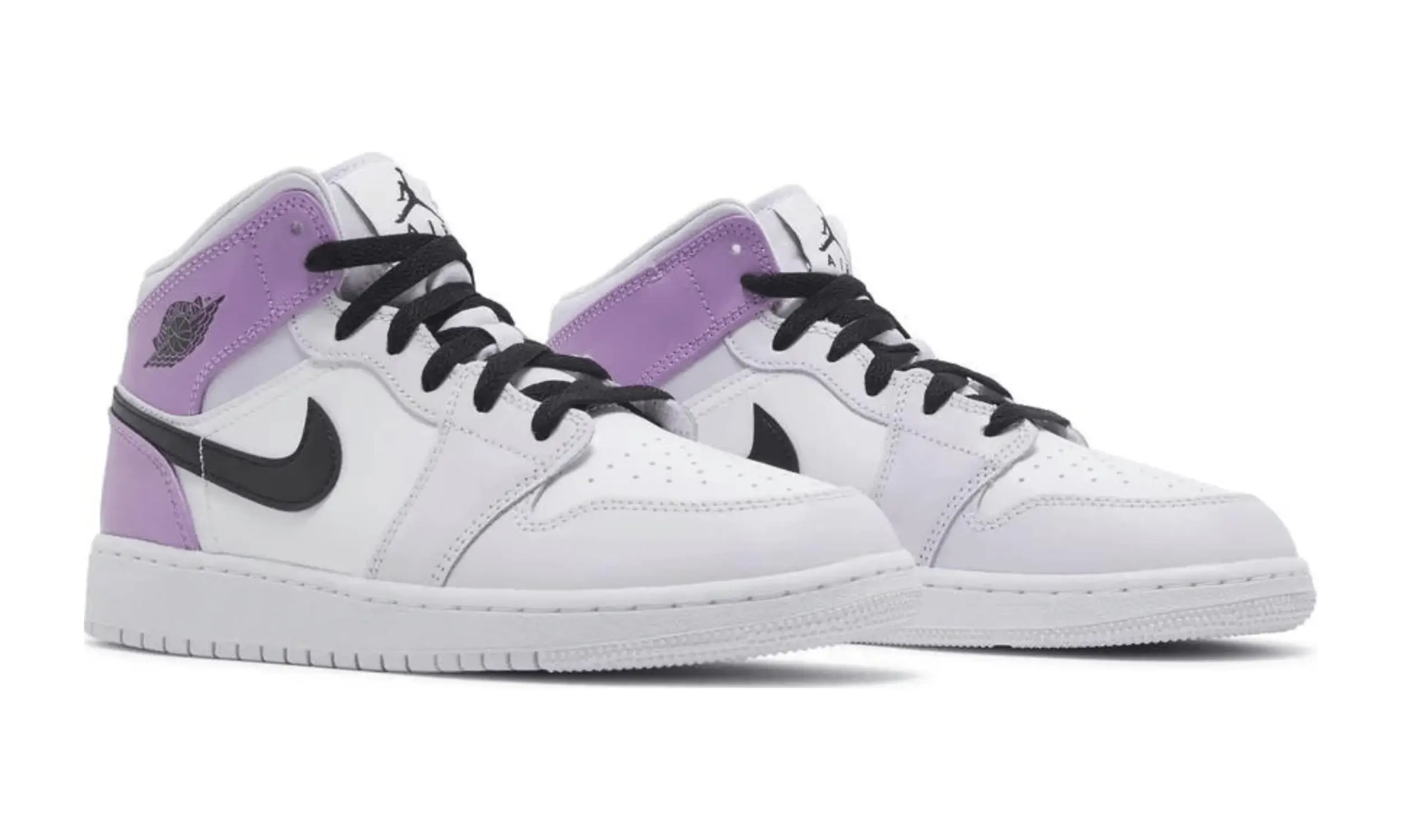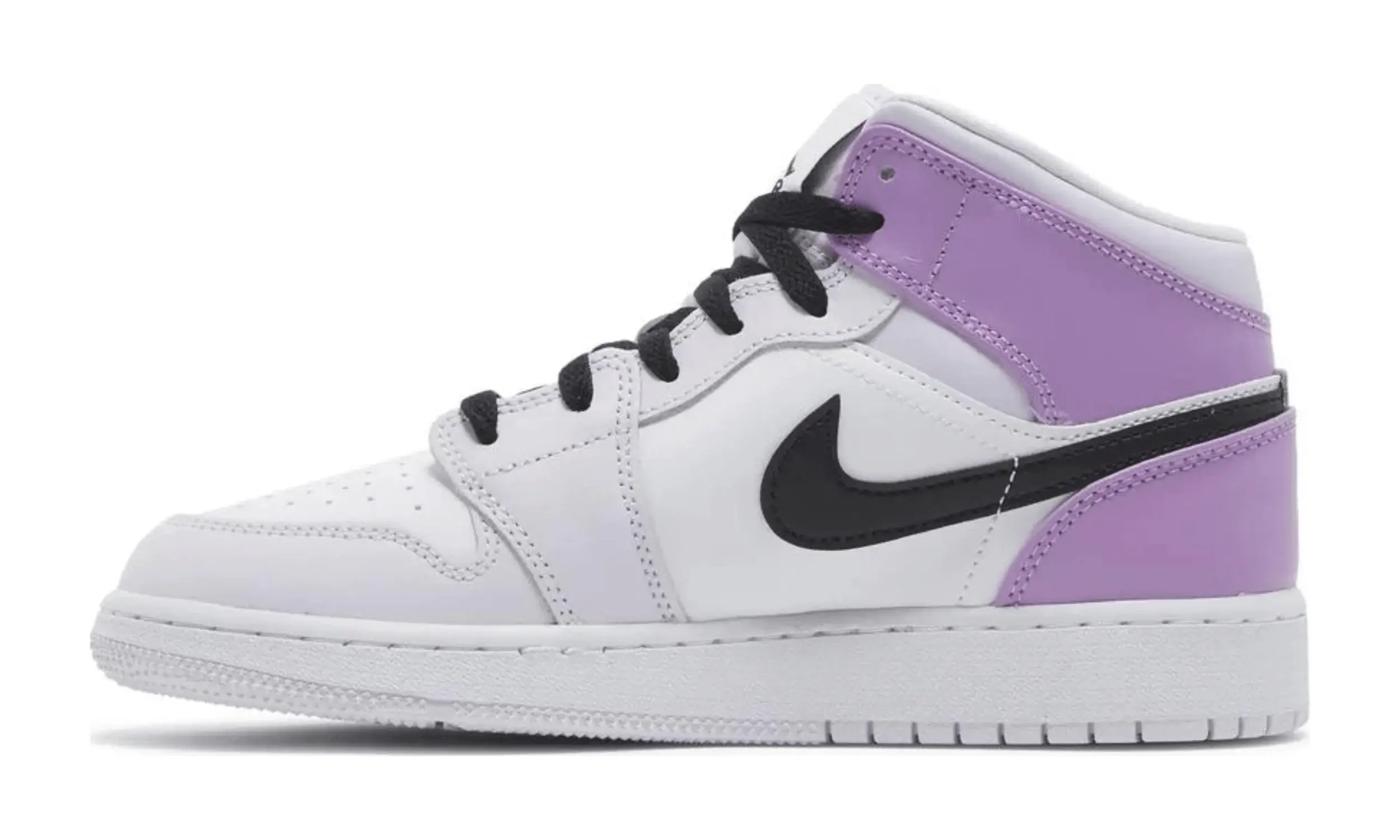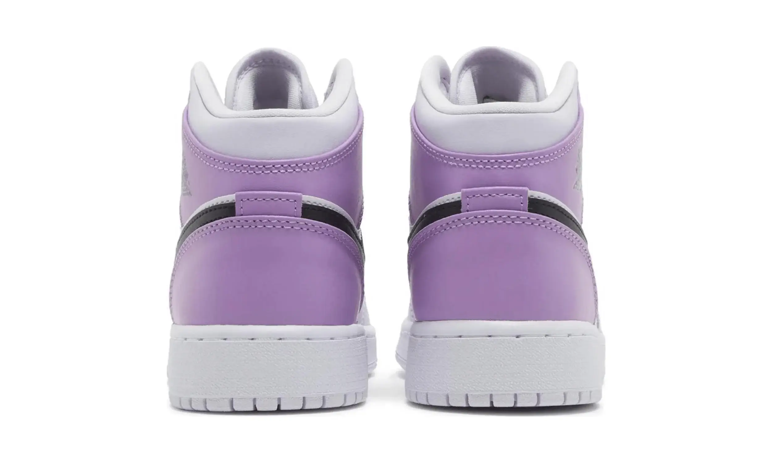 Cholewka butów Air Jordan 1 Mid Barely Grape wykonana jest z gładkiej, wysokiej jakości skóry, łączącej odcienie różu i lawendy. Przednia część buta i system sznurowania mają delikatny, lawendowy kolor, natomiast obszar wokół kostki i pięty wyróżnia się bardziej intensywną fuksją.