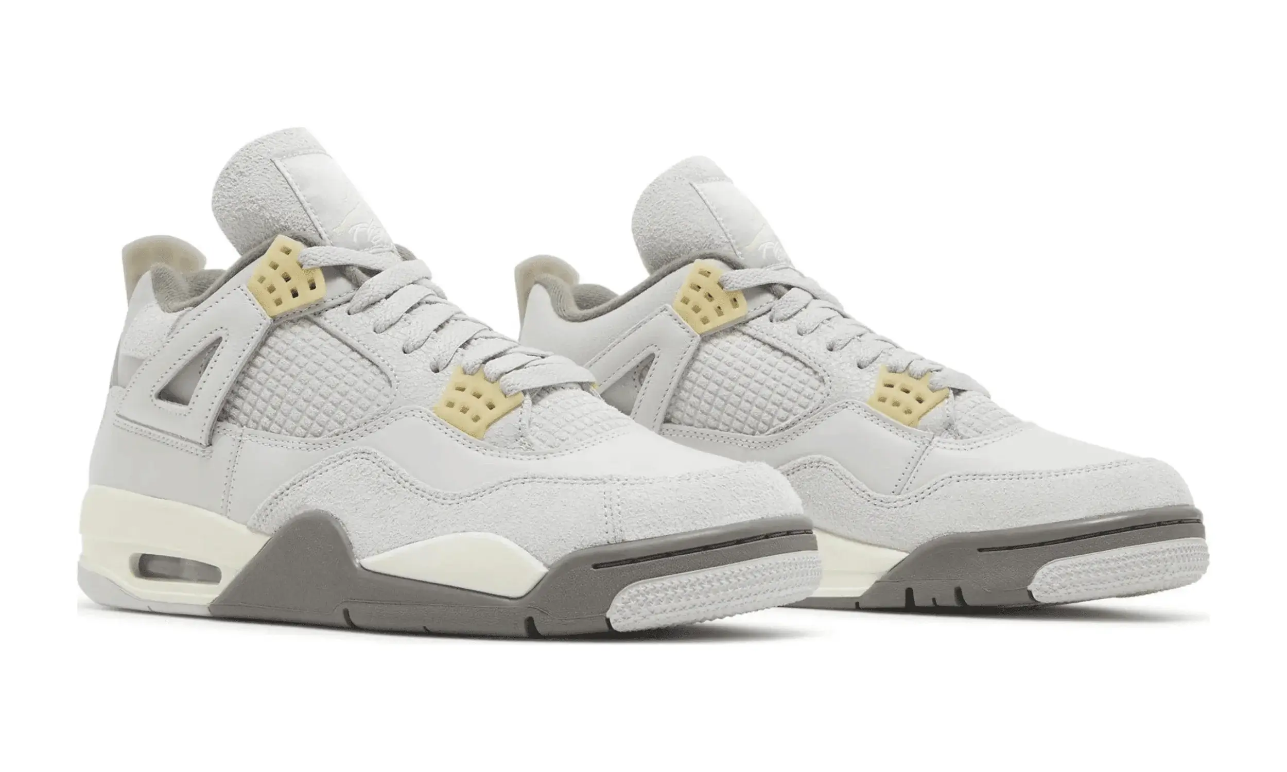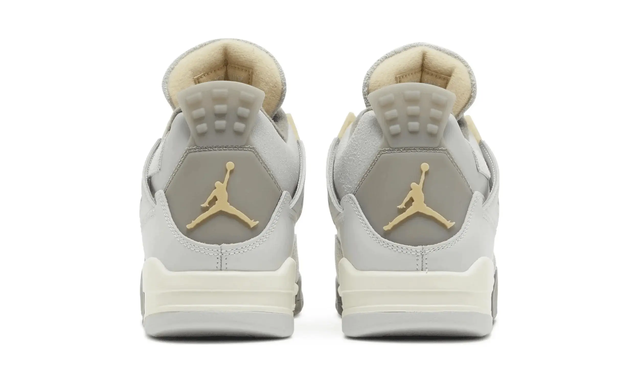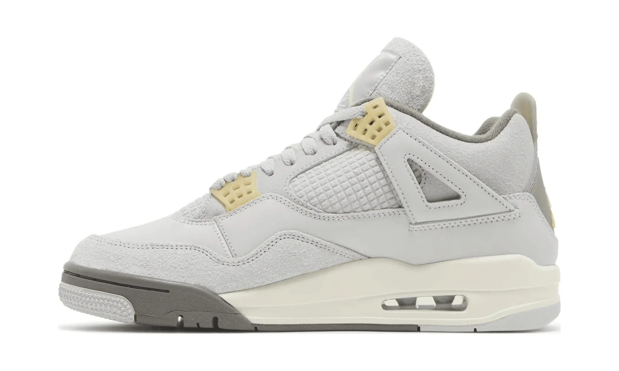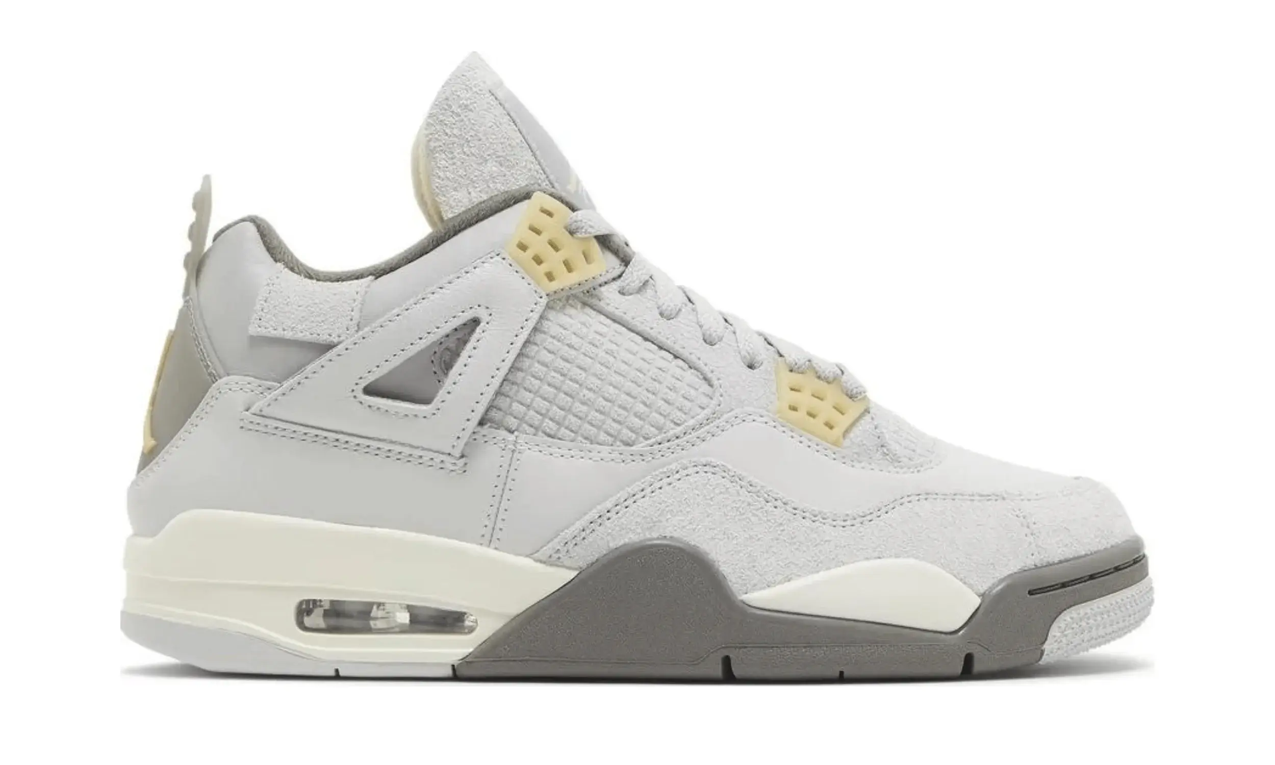 Buty Air Jordan 4 Craft Photon Dust wyróżniają się jasnoszarą skórzaną cholewką, której towarzyszy tonalny zamsz na kołnierzu oraz na przedniej części stopy. Skrzydełka nośne z popękanej skóry oraz siateczkowy zamsz zastępujący tradycyjną plastikową siatkę na bocznym panelu to innowacyjne zmiany w stosunku do modelu z 1989 roku. Subtelne detale w kolorze jasnej wanilii pojawiają się na uformowanych oczkach i logo Jumpman na języku i pięcie.