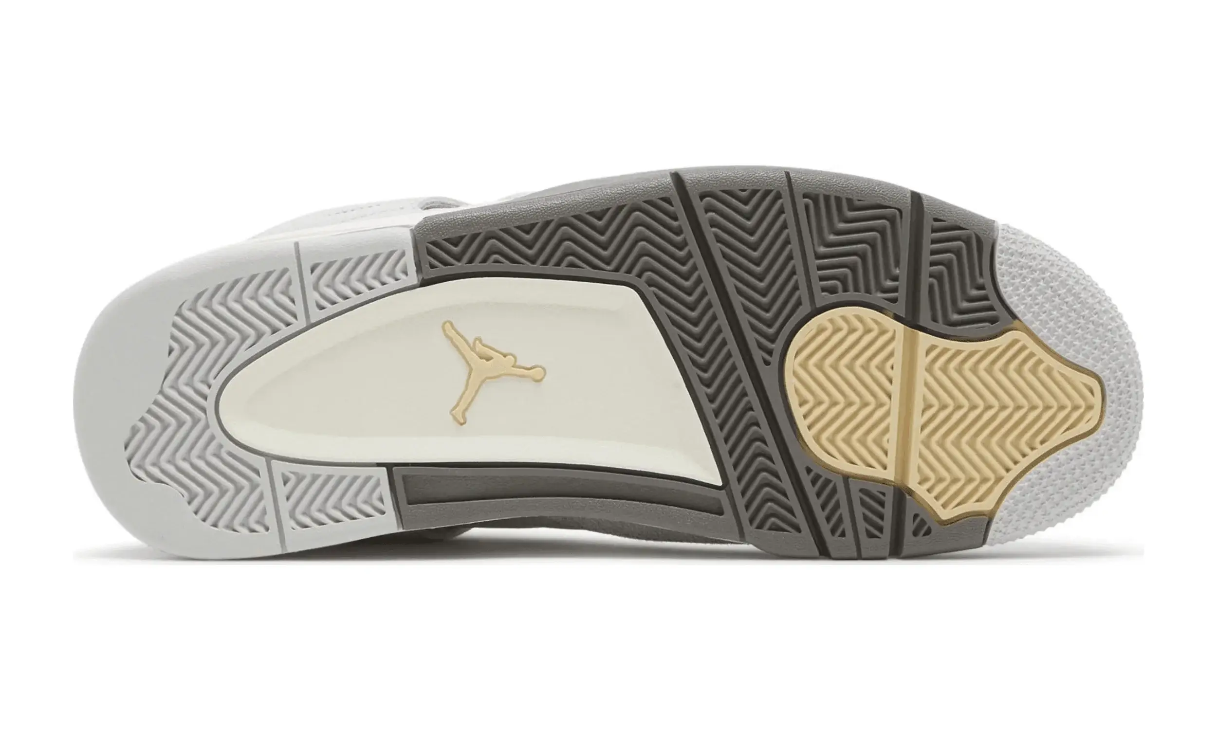 Tylni panel wykonany z tworzywa w ciemnym odcieniu szarości doskonale kontrastuje z kremowo-szarą podeszwą, która zawiera widoczną poduszkę powietrzną w pięcie. Całość dopełniają akcenty w przytłumionym odcieniu żółci na oczkach do sznurówek oraz logo Jumpman.