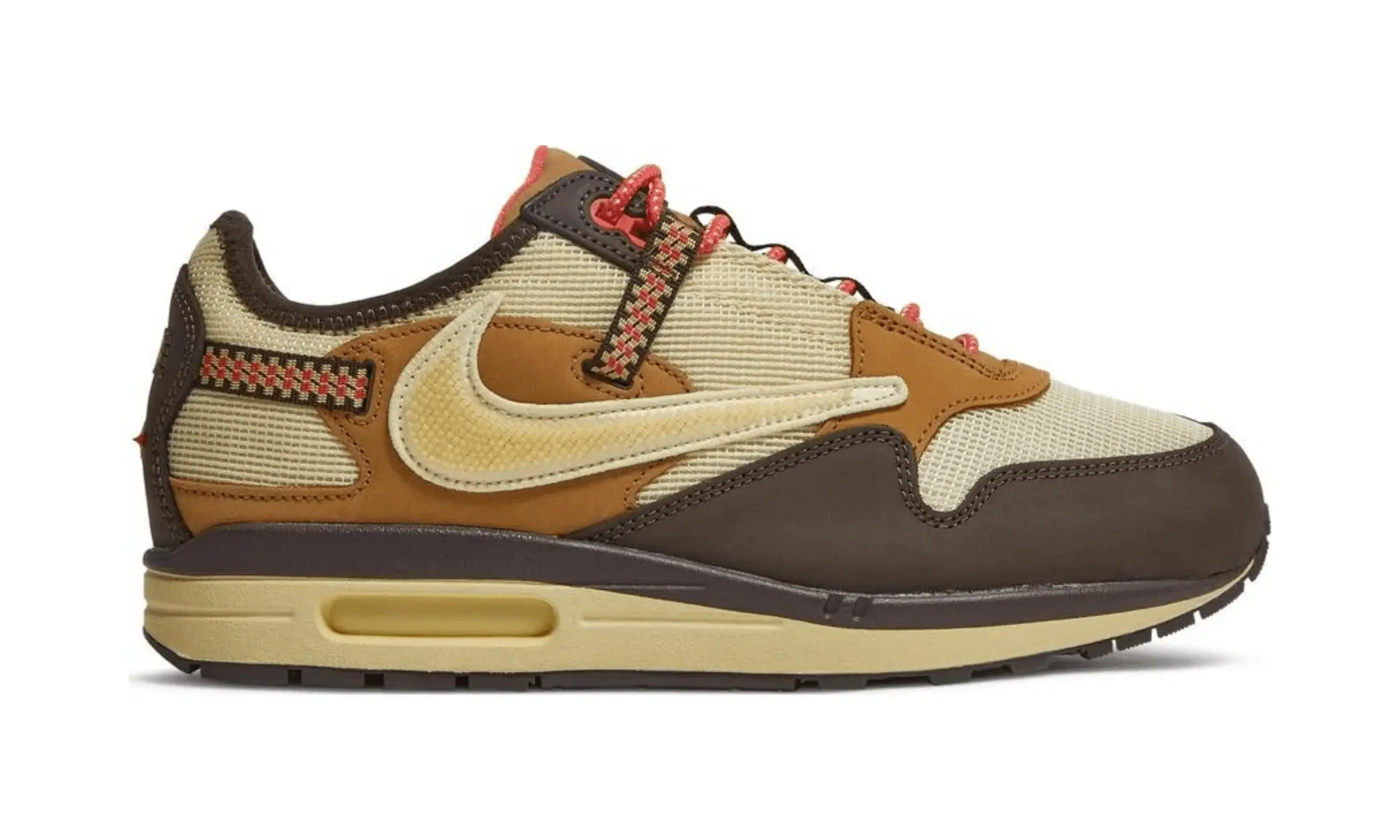 Nike Air Max 1 Travis Scott Baroque Brown to model zaprojektowany we współpracy z legendarnym artystą Travisem Scottem, jego wytwórnią Cactus Jack oraz marką Air Jordan, sławnego koszykarza. Cholewka butów łączy kremową siateczkę z ciemnobrązowymi skórzanymi nakładkami oraz brązowym nubukowym błotnikiem.