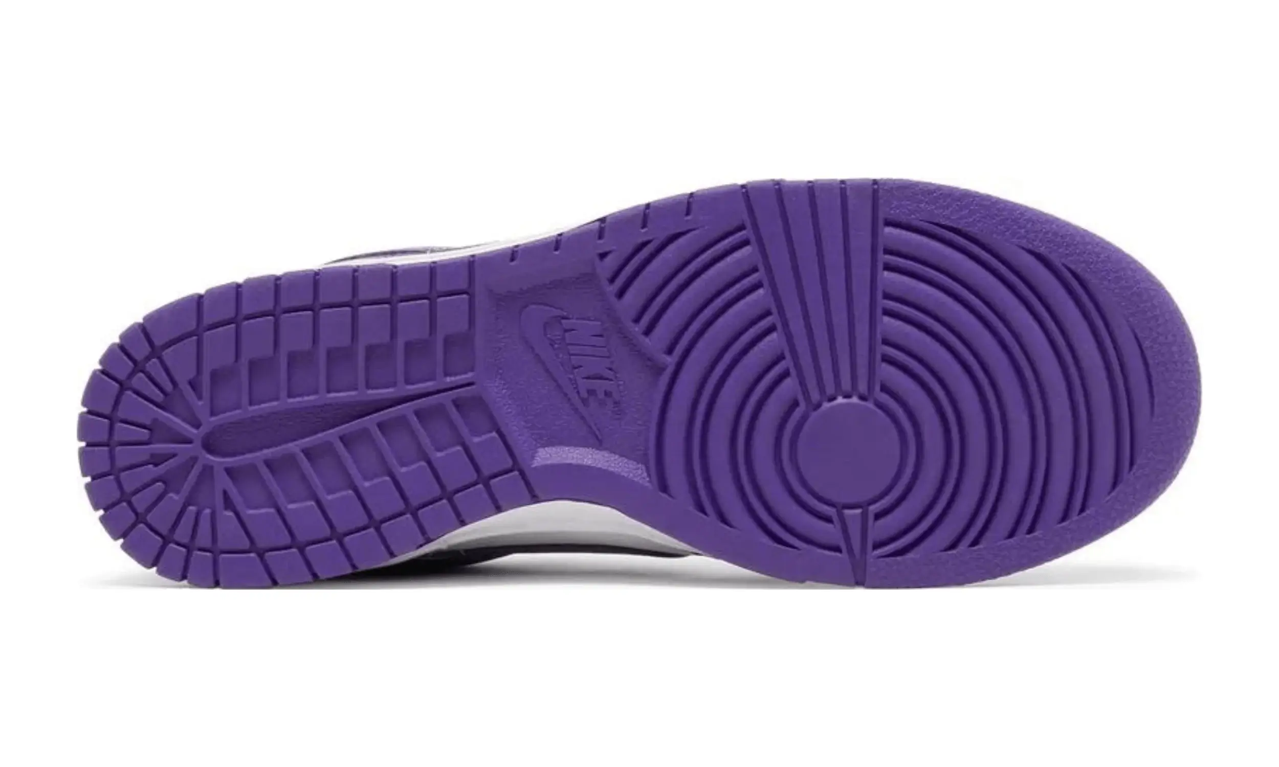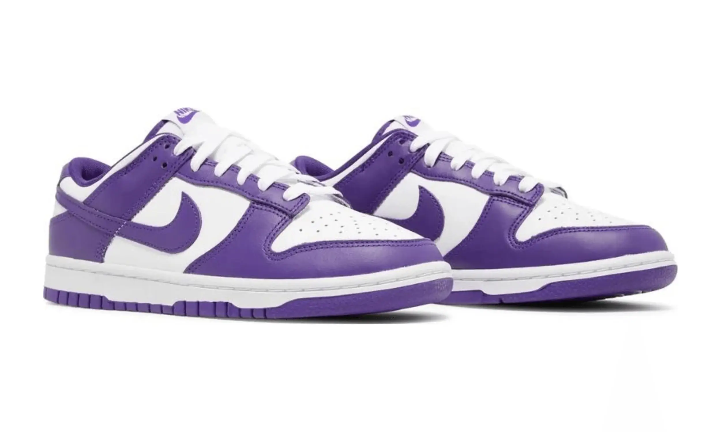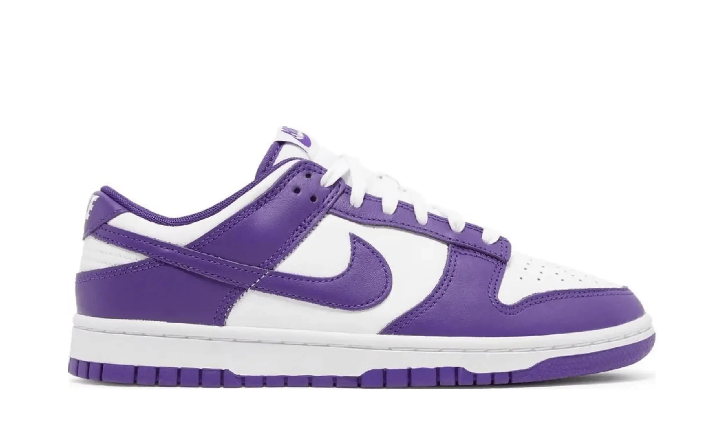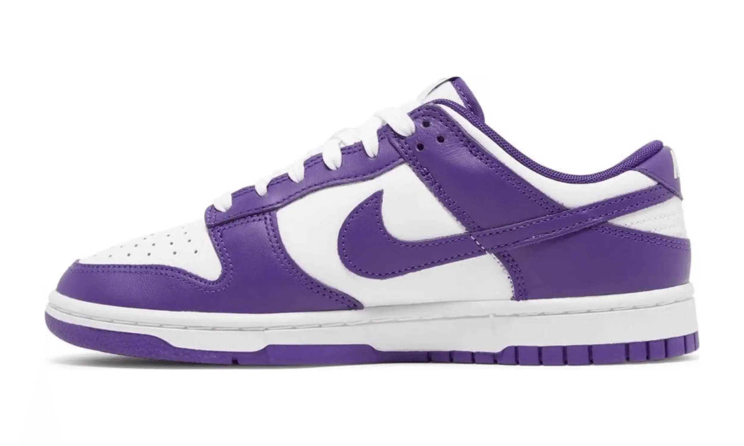 Nike Dunk Low Championship Purple to model oparty na projekcie kolekcji Nike Dunk Low Petera Moore’a z 1985 roku. Buty wyróżniają się dwukolorową skórzaną cholewką. Bazą jest biały kolor, a uzupełniają go fioletowe nakładki.