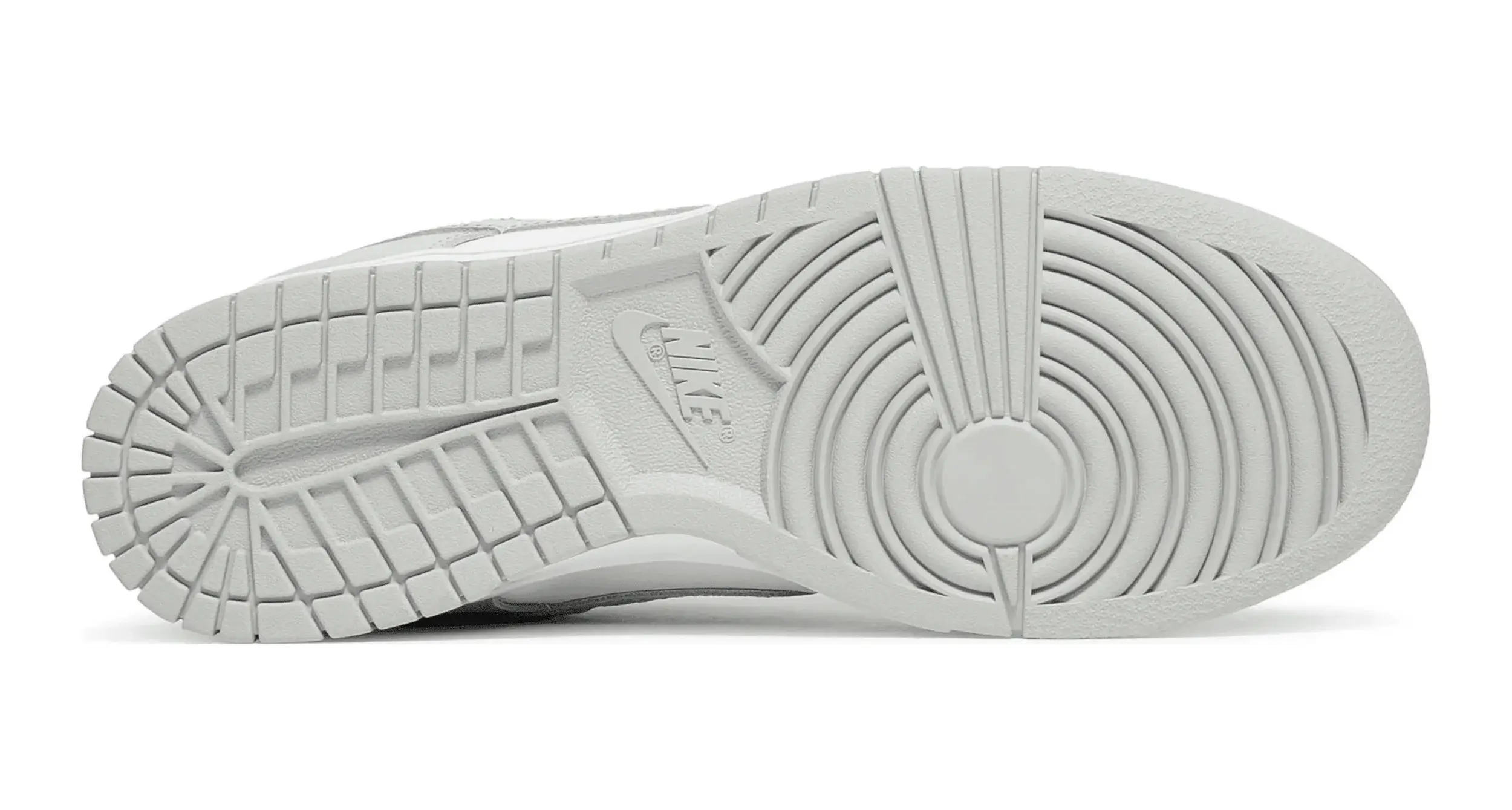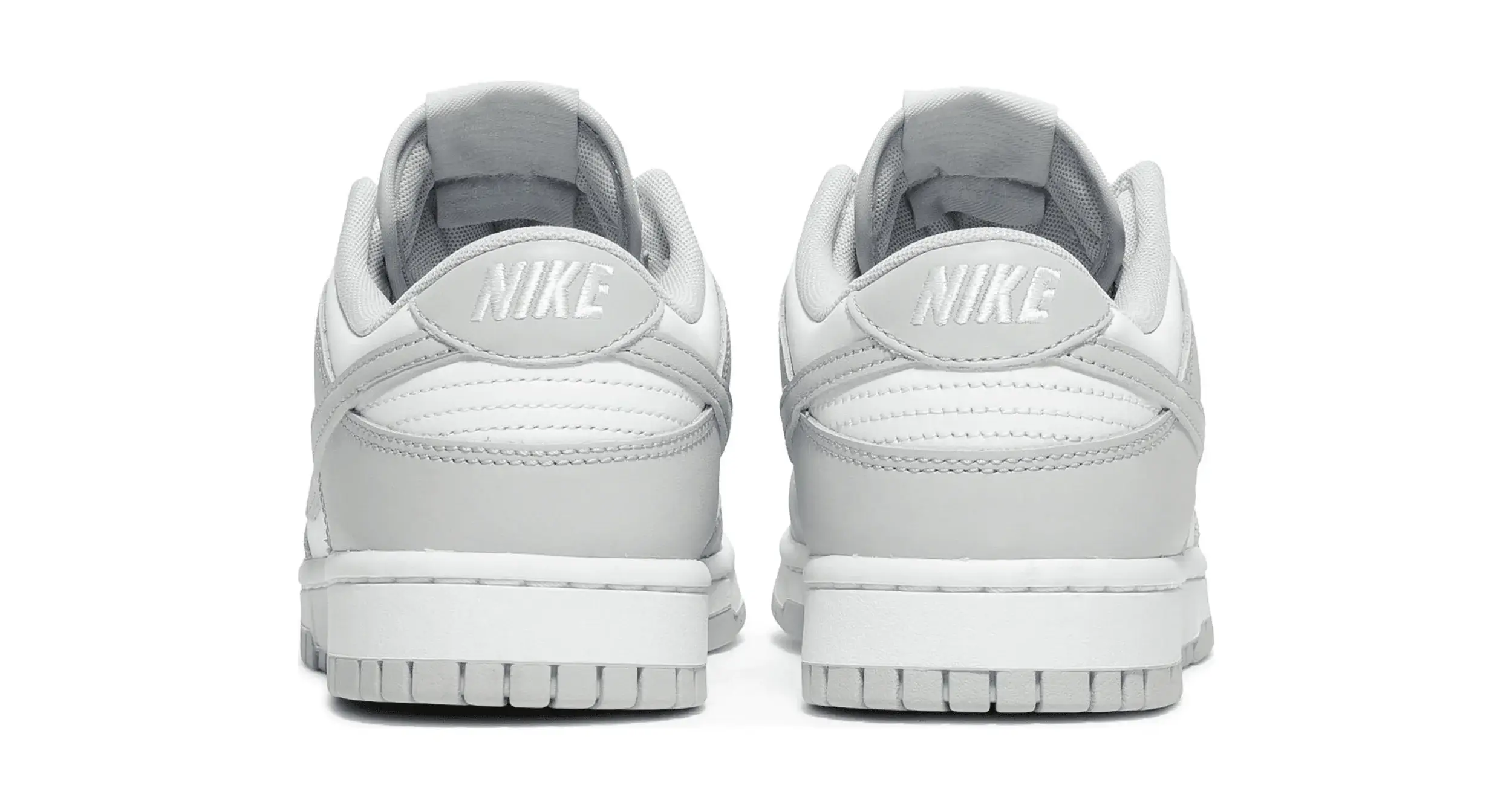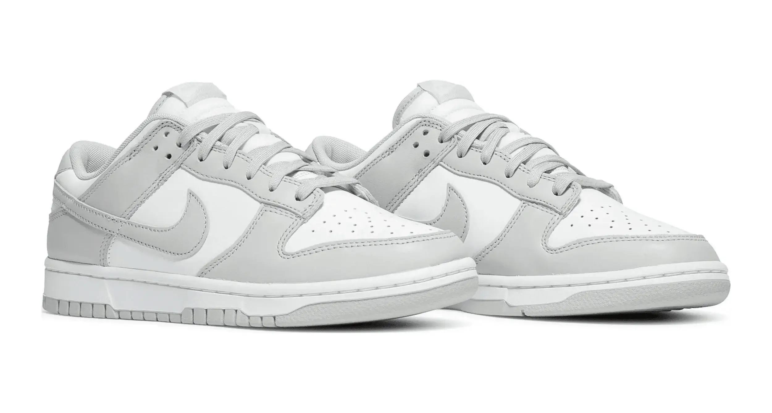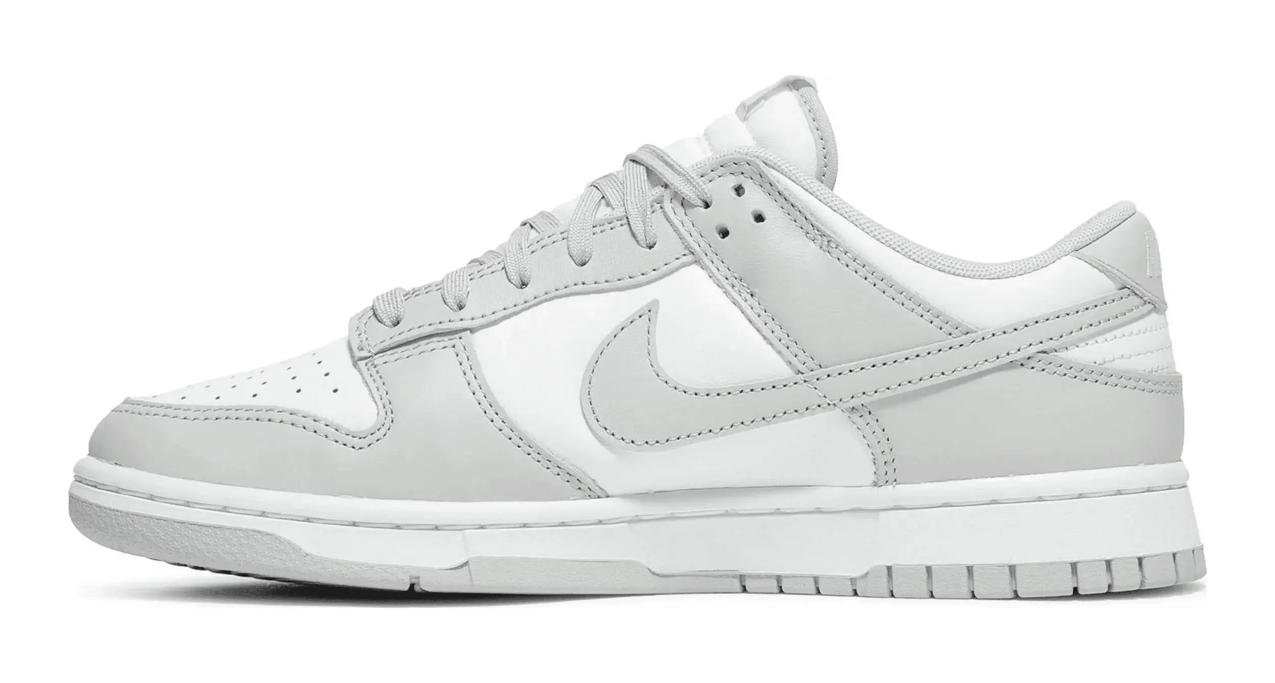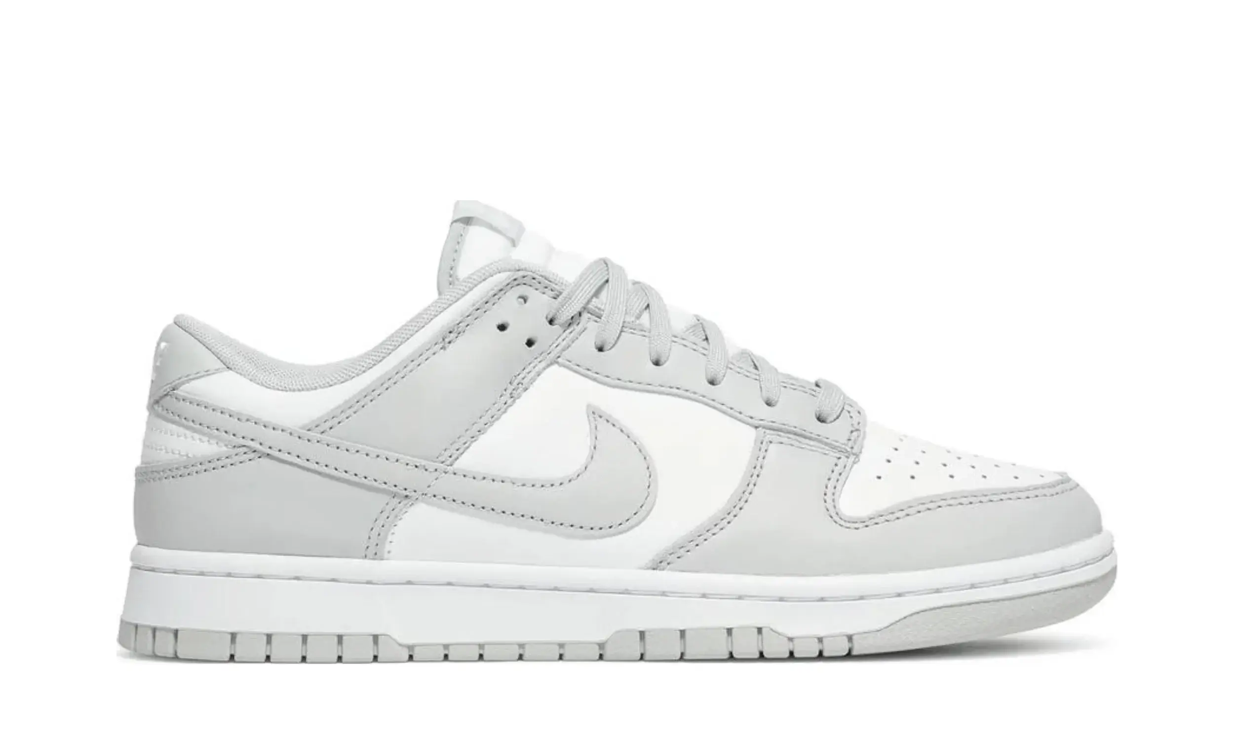 Buty do koszykówki Nike Dunk Low „Grey Fog” mają subtelną dwukolorową kolorystykę klasycznego fasonu, pierwotnie wydanego w 1985 roku jako buty do koszykówki w college’u. Całkowicie skórzaną cholewkę pokryto nieskazitelną białą podstawą z kontrastowymi nakładkami w jasnoszarym odcieniu. Ten sam neutralny ton powtórzono na logo Swoosh, sznurowadłach i tkanej metce Nike na języku. Dodatkowe logo Nike znajduje się na zapiętku i wyściełanej wkładce. Niski blat spoczywa na standardowej gumowej podeszwie, która łączy białe ściany boczne z szarą gumową podeszwą zewnętrzną.