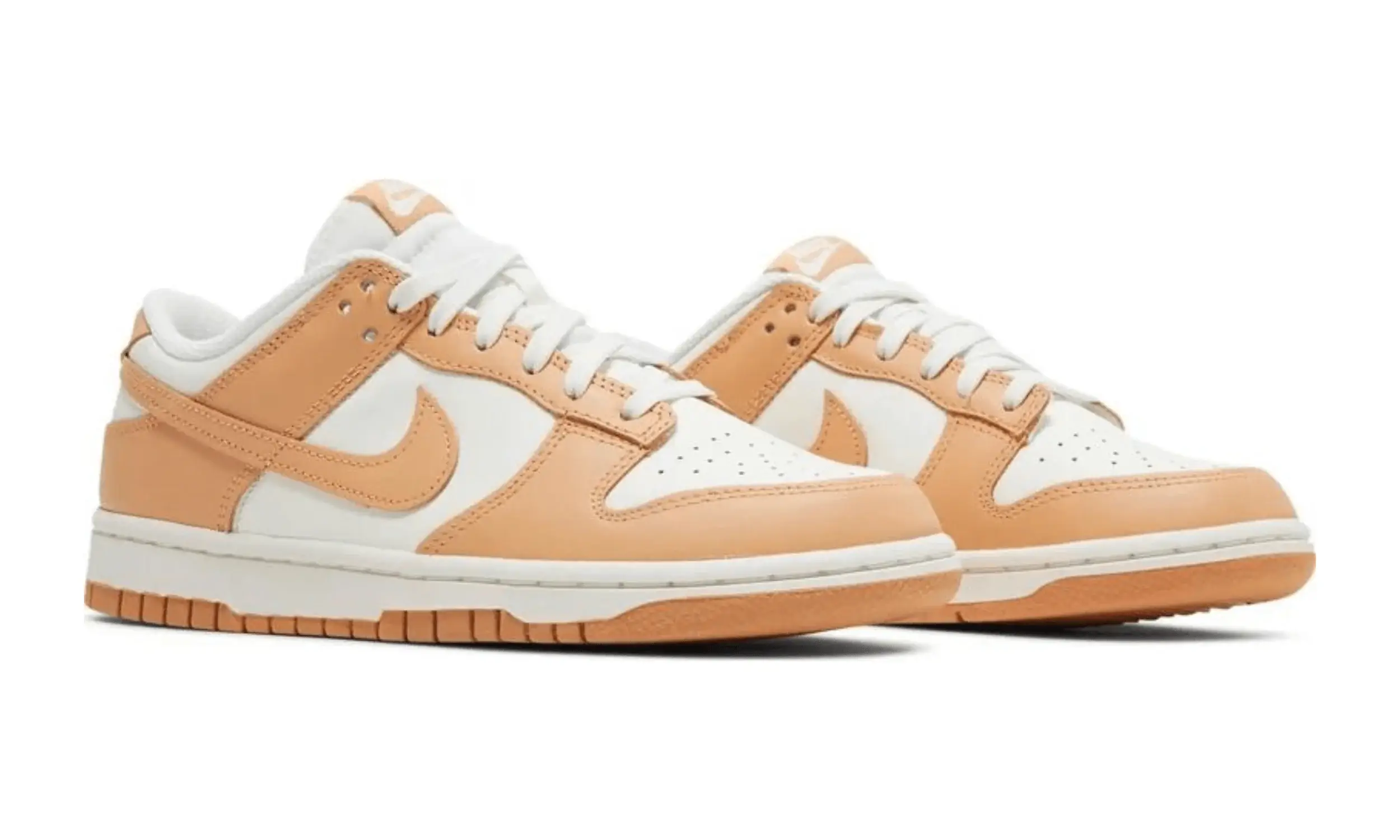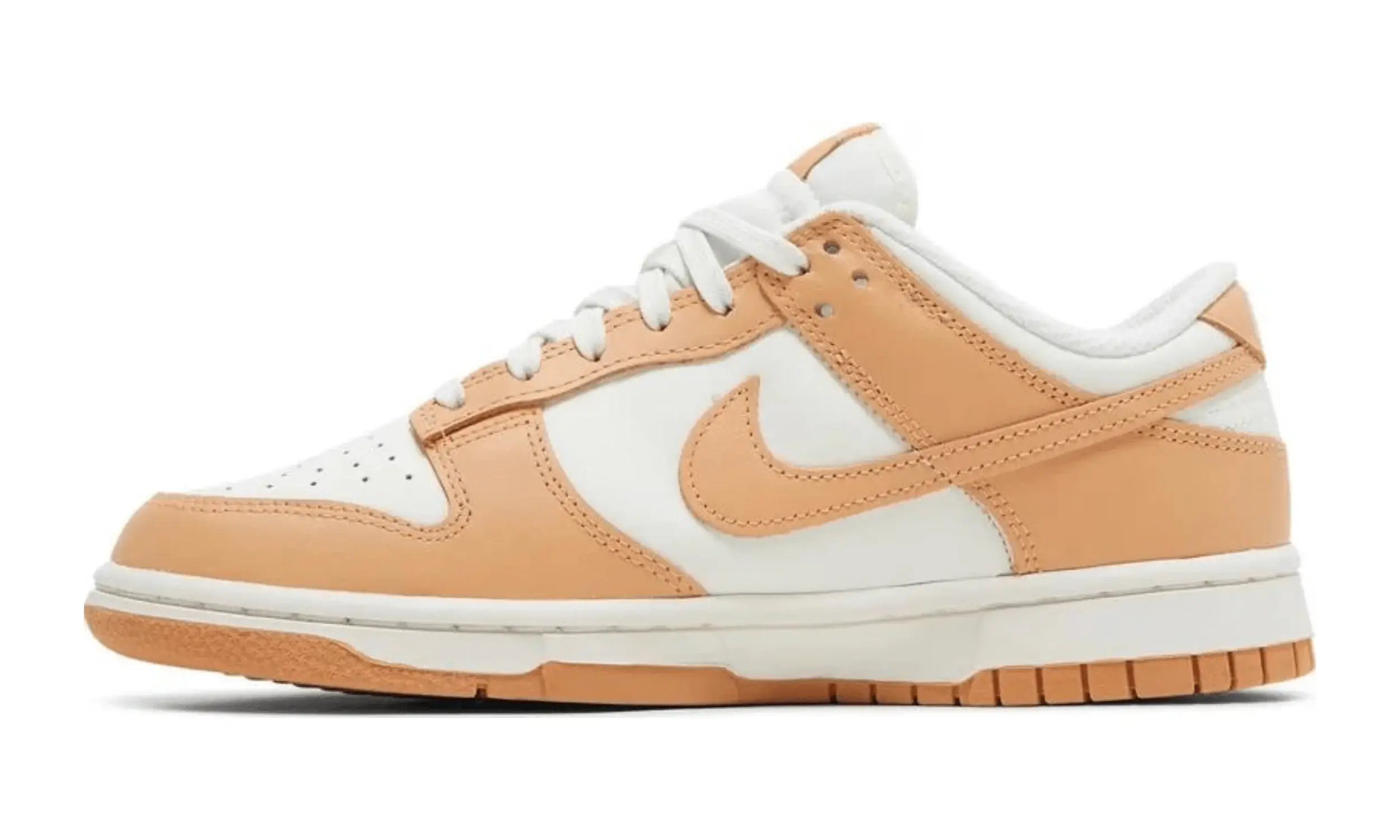 Model Nike Dunk Low Harvest Moon to kolorystyka bazująca na projekcie kolekcji Nike Dunk Low Petera Moore’a z 1985 roku. Buty wyróżniają się dwukolorową skórzaną cholewką. Bazą jest biały kolor, a uzupełniają go brzoskwiniowe nakładki.