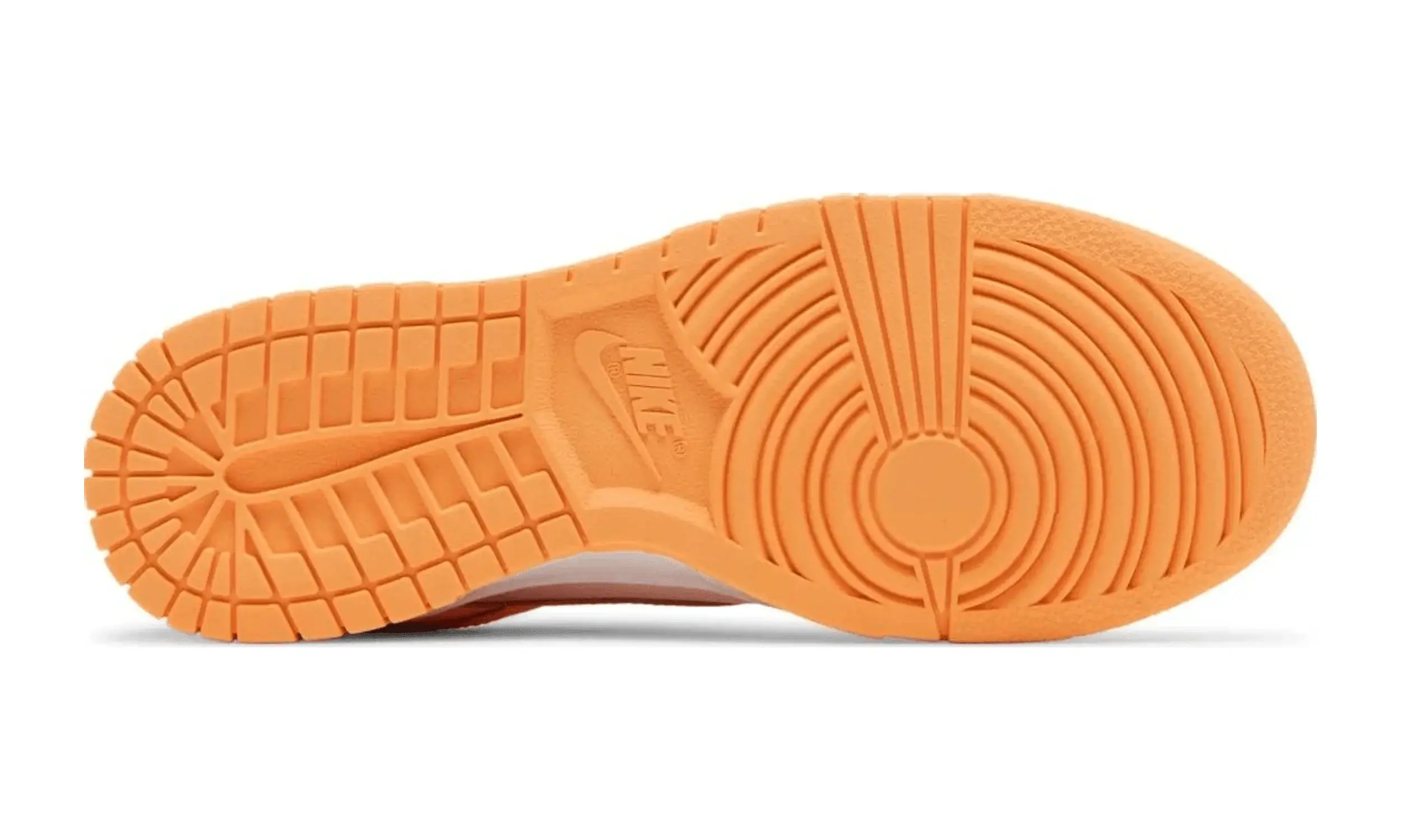 Na języku w kolorze białym widnieje pomarańczowy napis Nike, a poniżej niego ikoniczny Swoosh, również w tym samym kolorze. Całość dopełnia jasnopomarańczowa podeszwa zewnętrzna z białymi akcentami na panelach bocznych podeszwy środkowej, tworząc intrygujący kontrast.