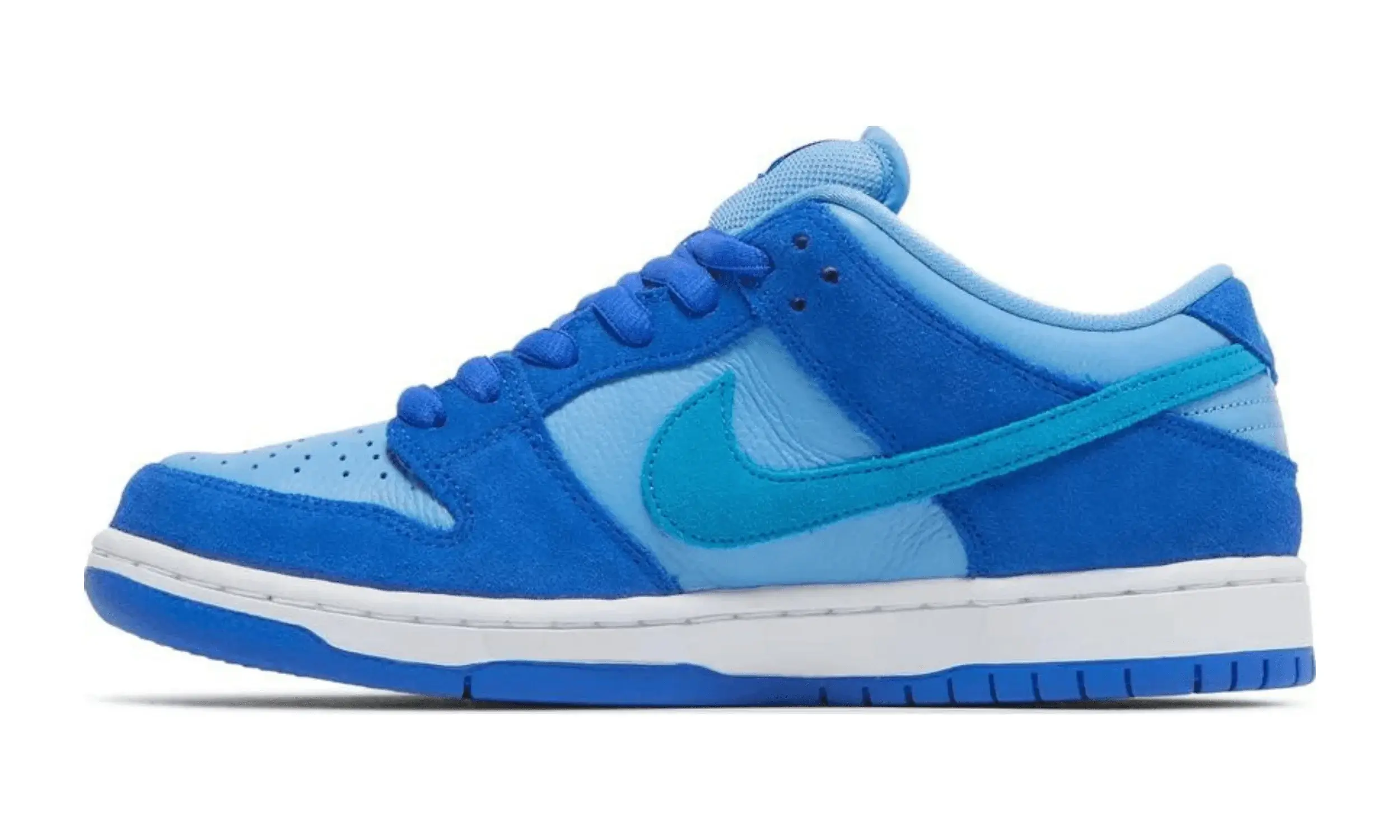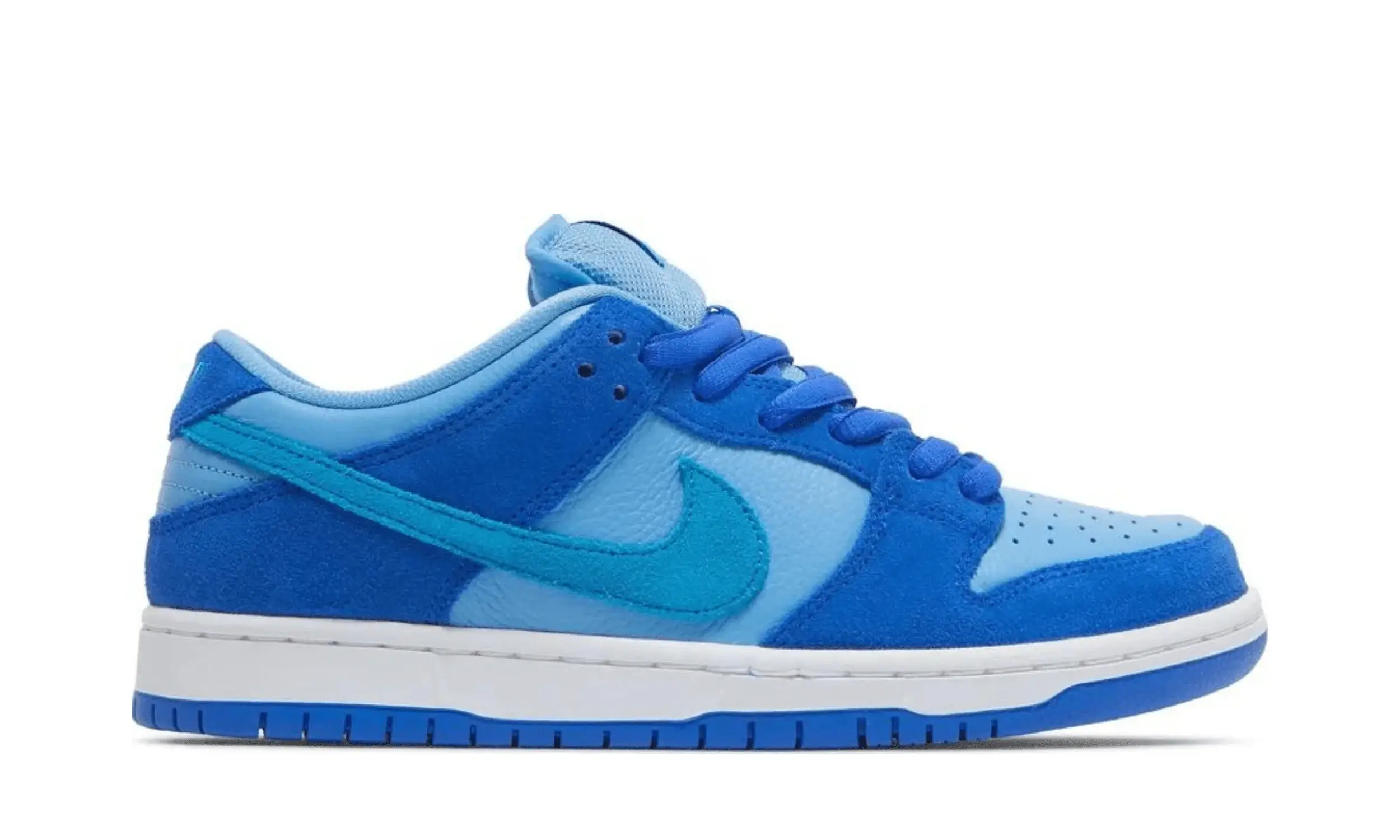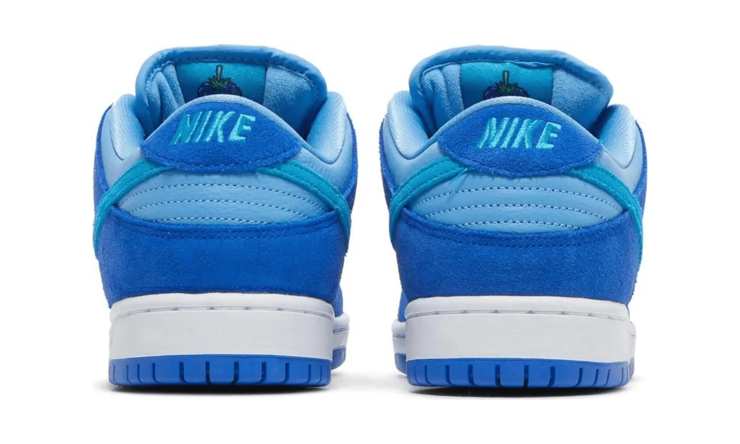 Nike Dunk Low SB Blue Raspberry to model, która przyciąga wzrok swoją barwną kompozycją odcieni niebieskiego. Skórzana baza butów obejmuje jasnoniebieskie panele na bokach, przy kołnierzu i na toeboxie. Zamszowe nakładki na przedniej i tylnej części cholewki są w ciemniejszym odcieniu, tworząc spójną całość.