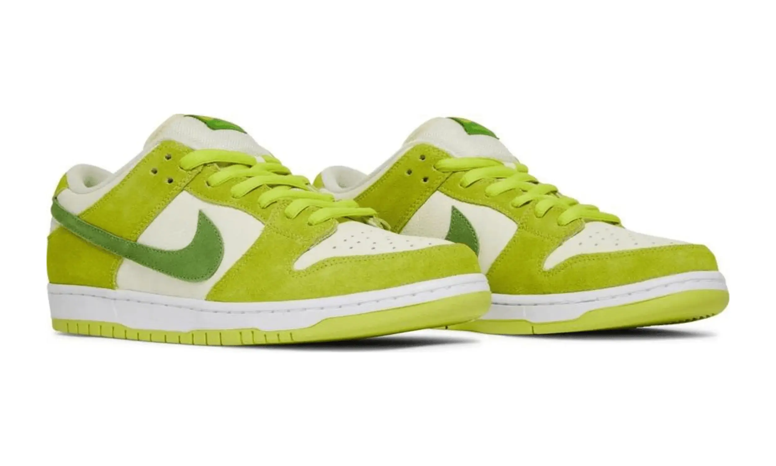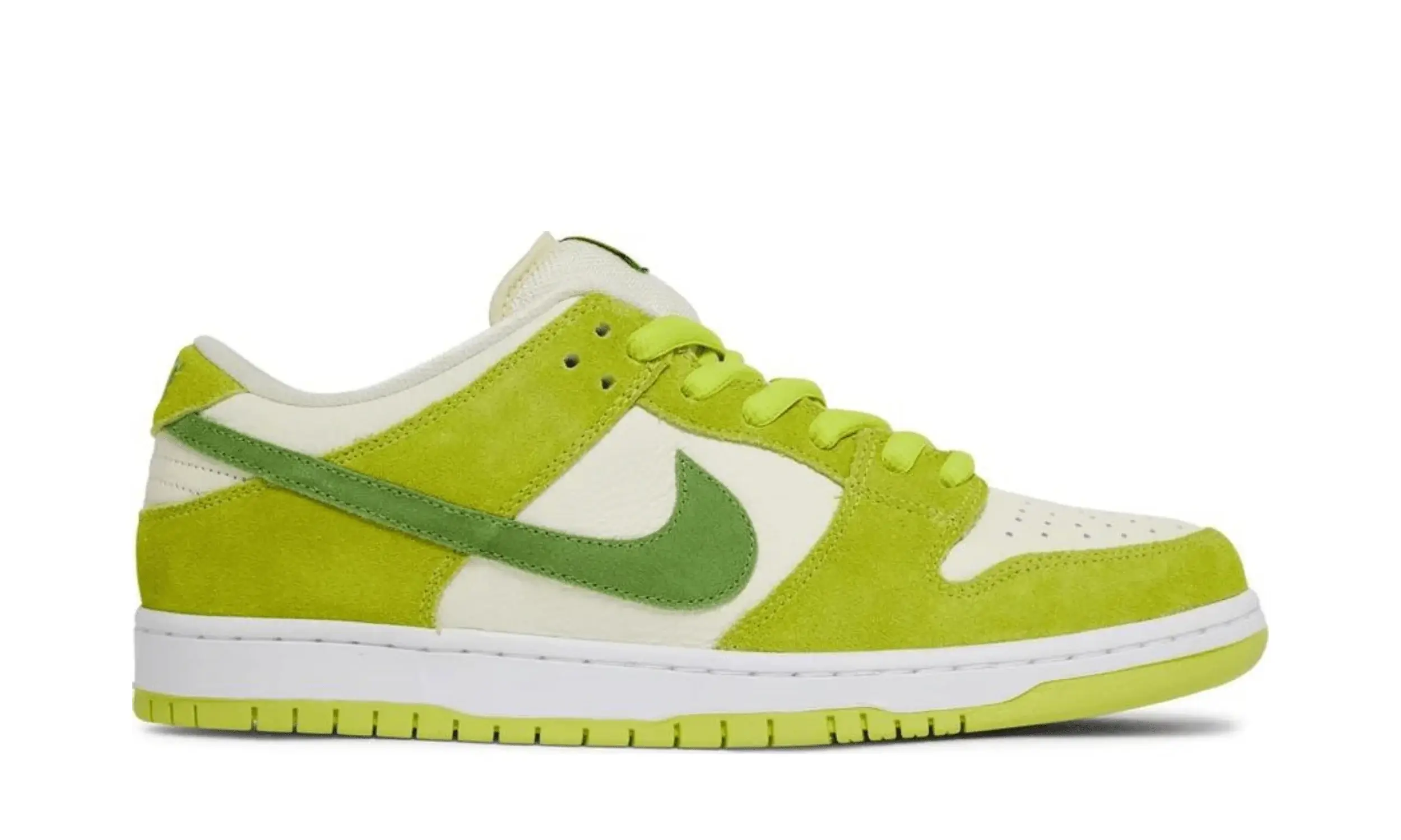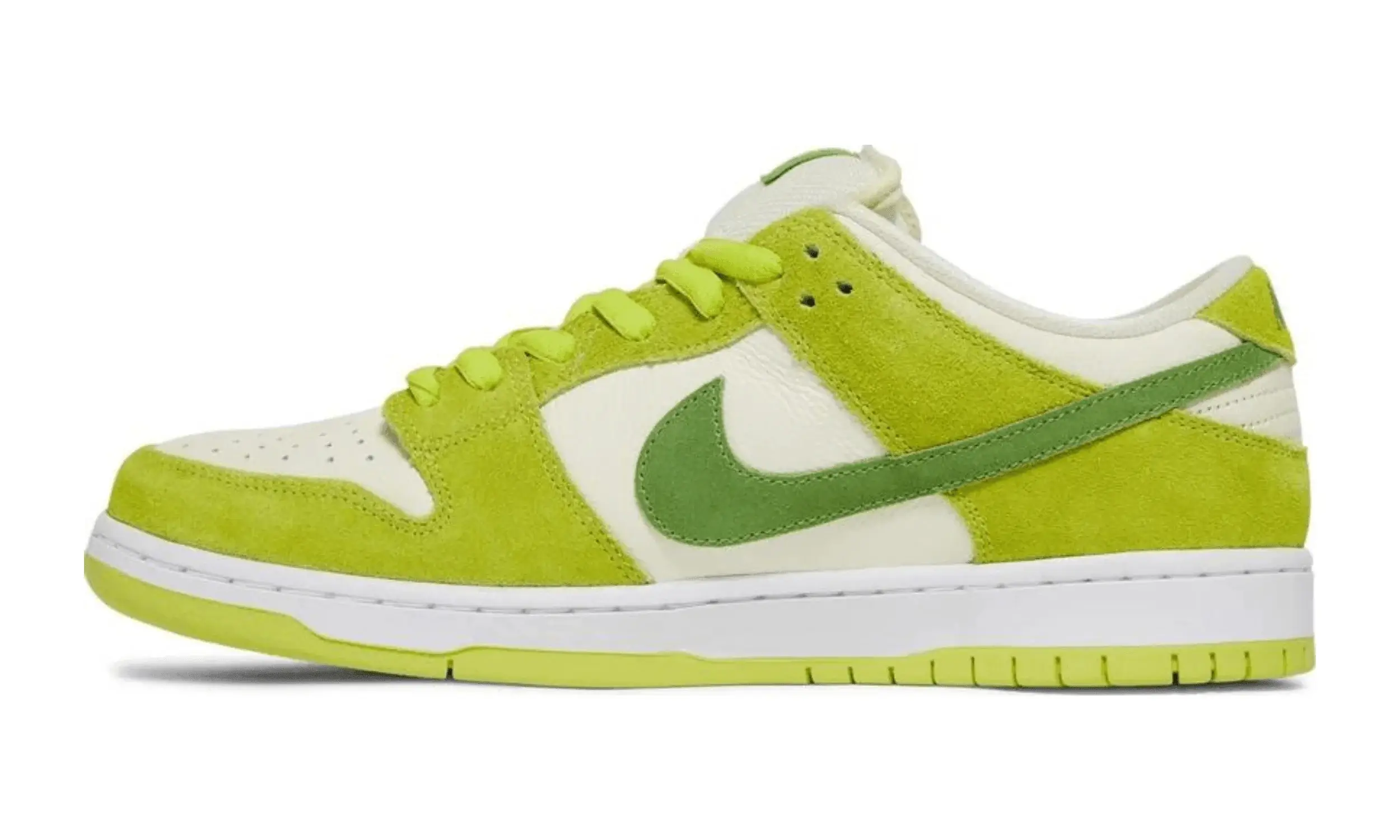 Nike Dunk Low SB Green Apple to wyjątkowe sneakersy, które stanowią część „Fruity Pack”. Inspirowane soczystym, zielonym jabłkiem, buty przyciągają wzrok swoją różnorodnością odcieni zieleni i unikalnymi detalami. Cholewka butów wykonana jest z kremowej, skóry, która stanowi idealną bazę dla zielonych, zamszowych nakładek.