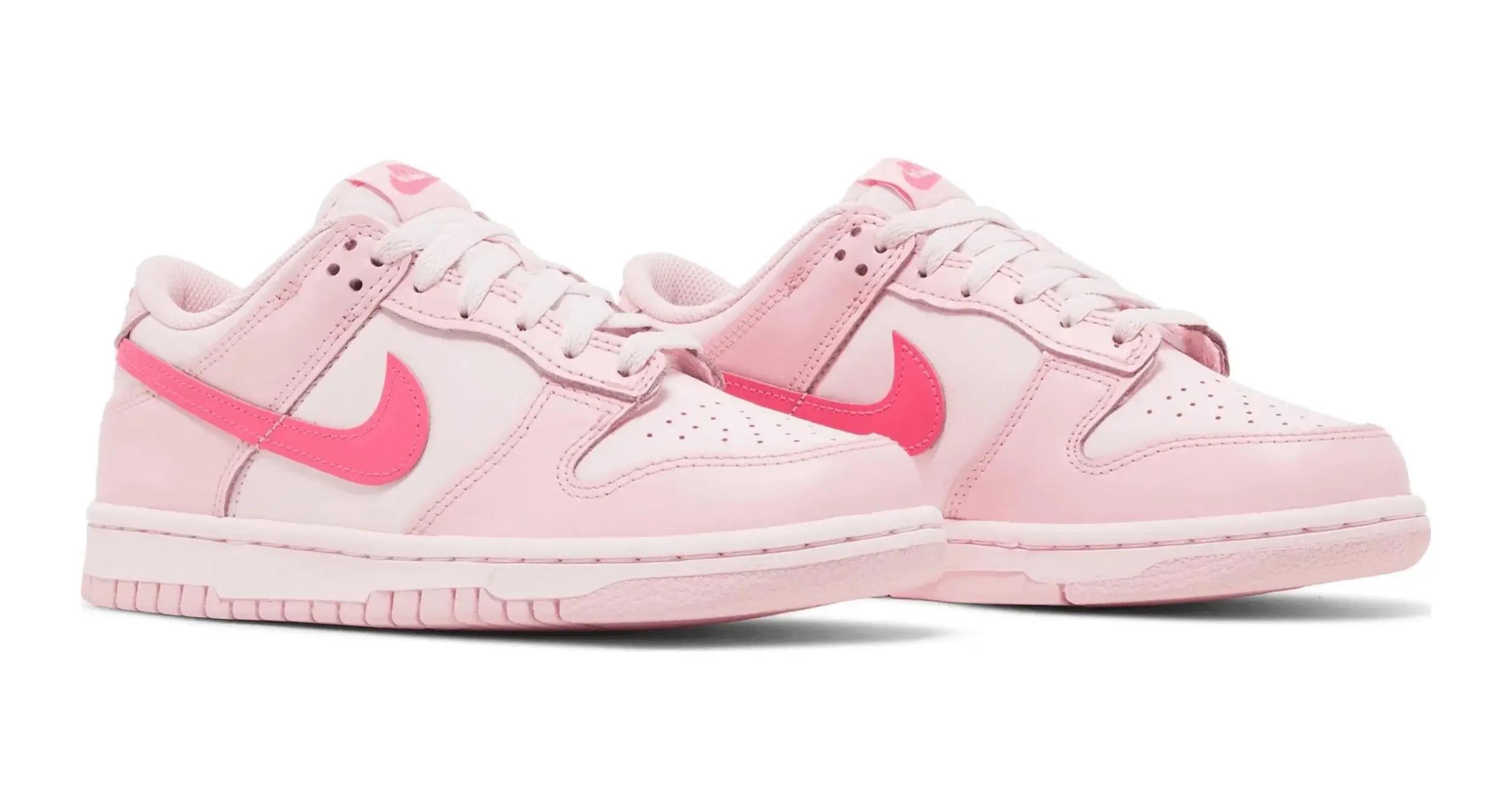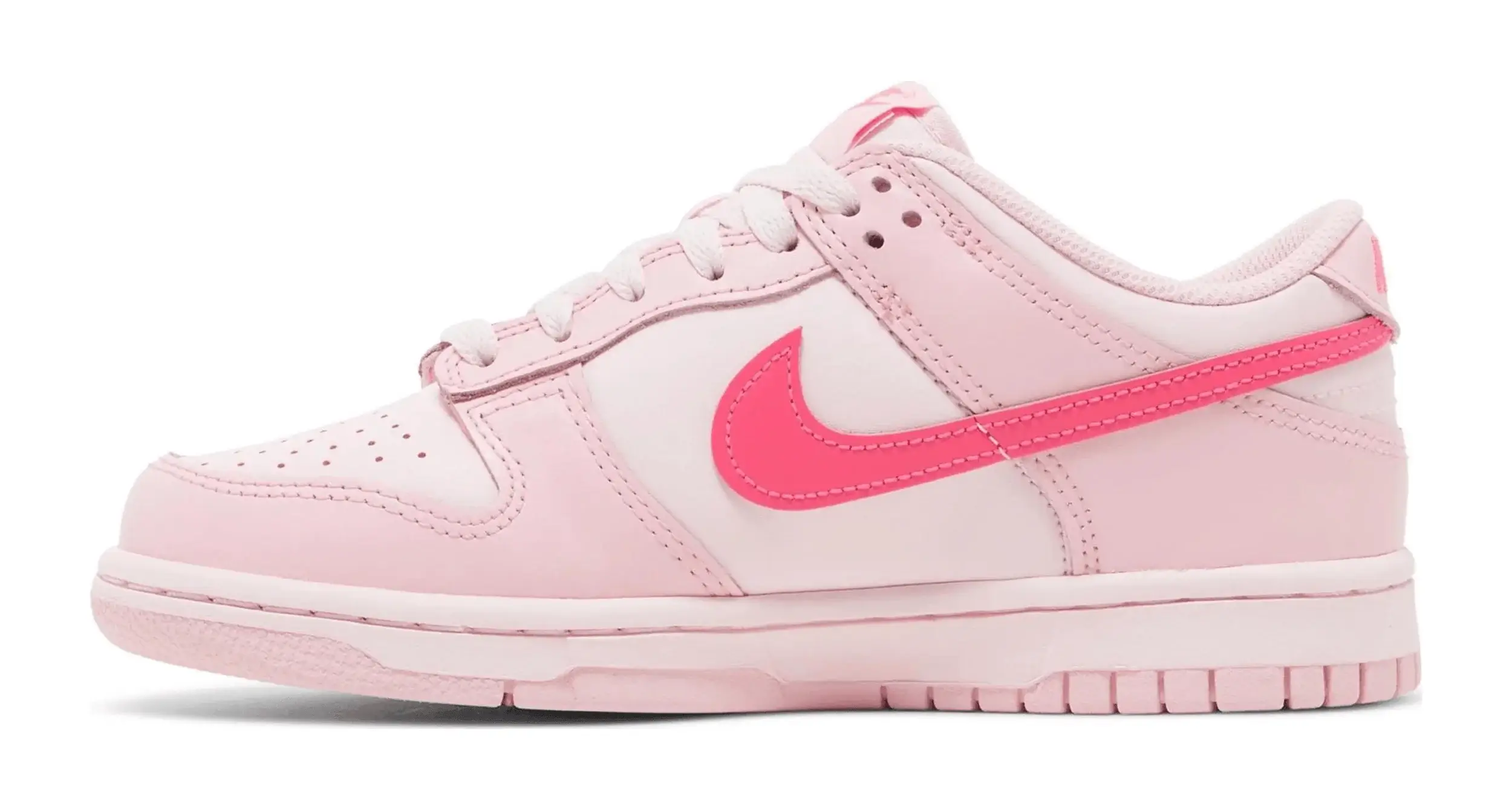 Nike Dunk Low Triple Pink to model, który wyróżnia się niezwykłą paletą różowych odcieni. Cholewka buta jest w całości wykonana z wysokiej jakości skóry, prezentując różnorodne odcienie różu.
