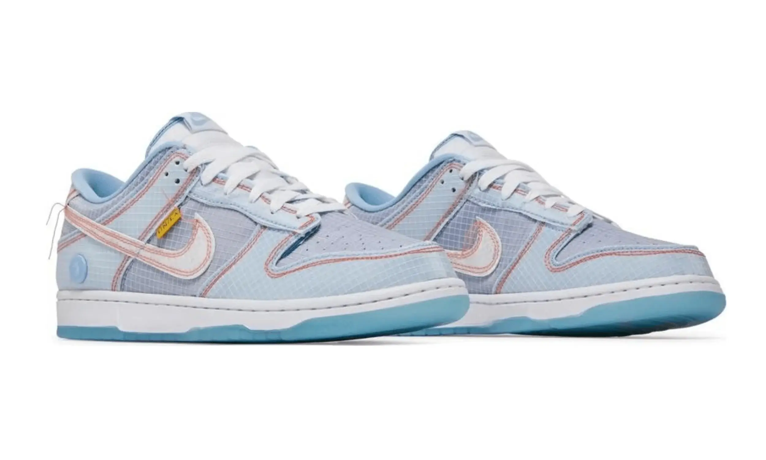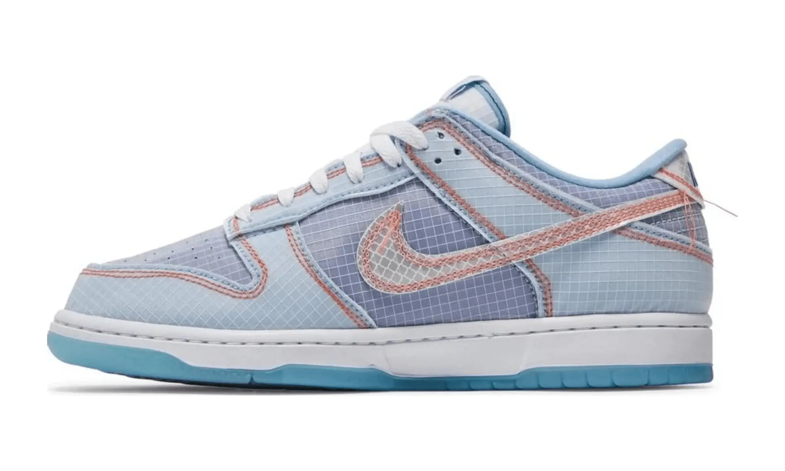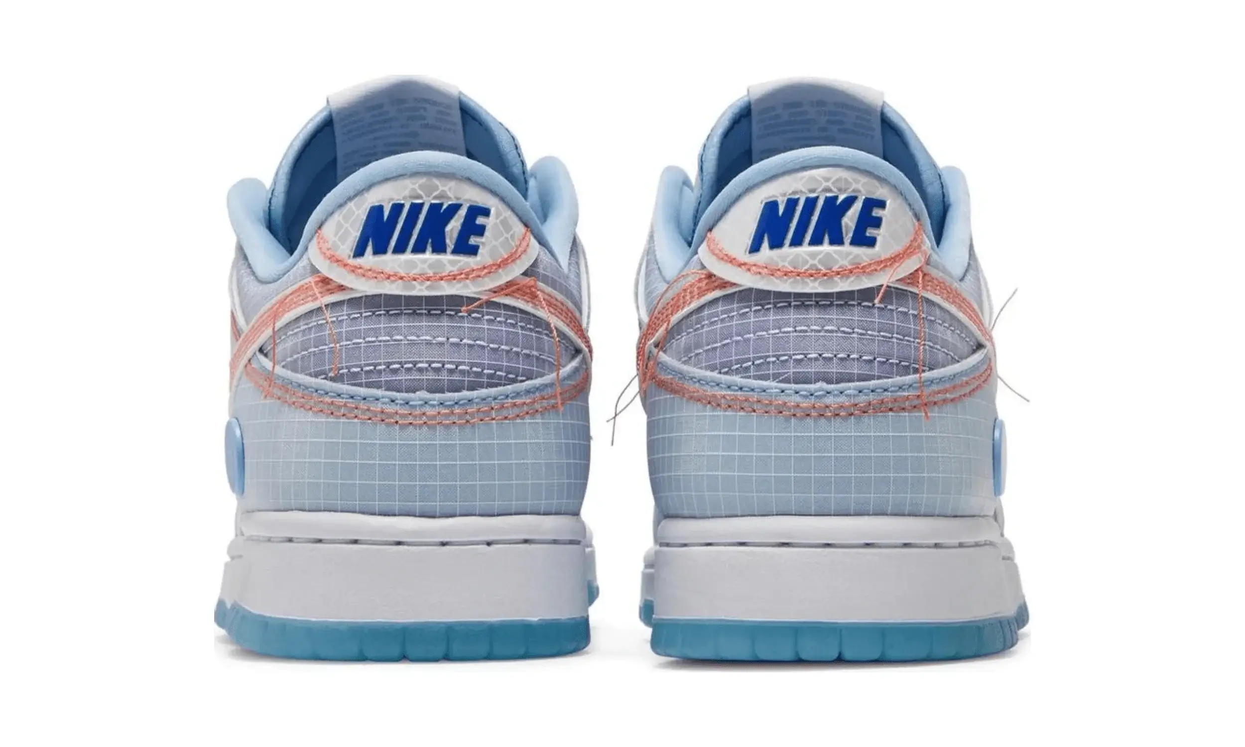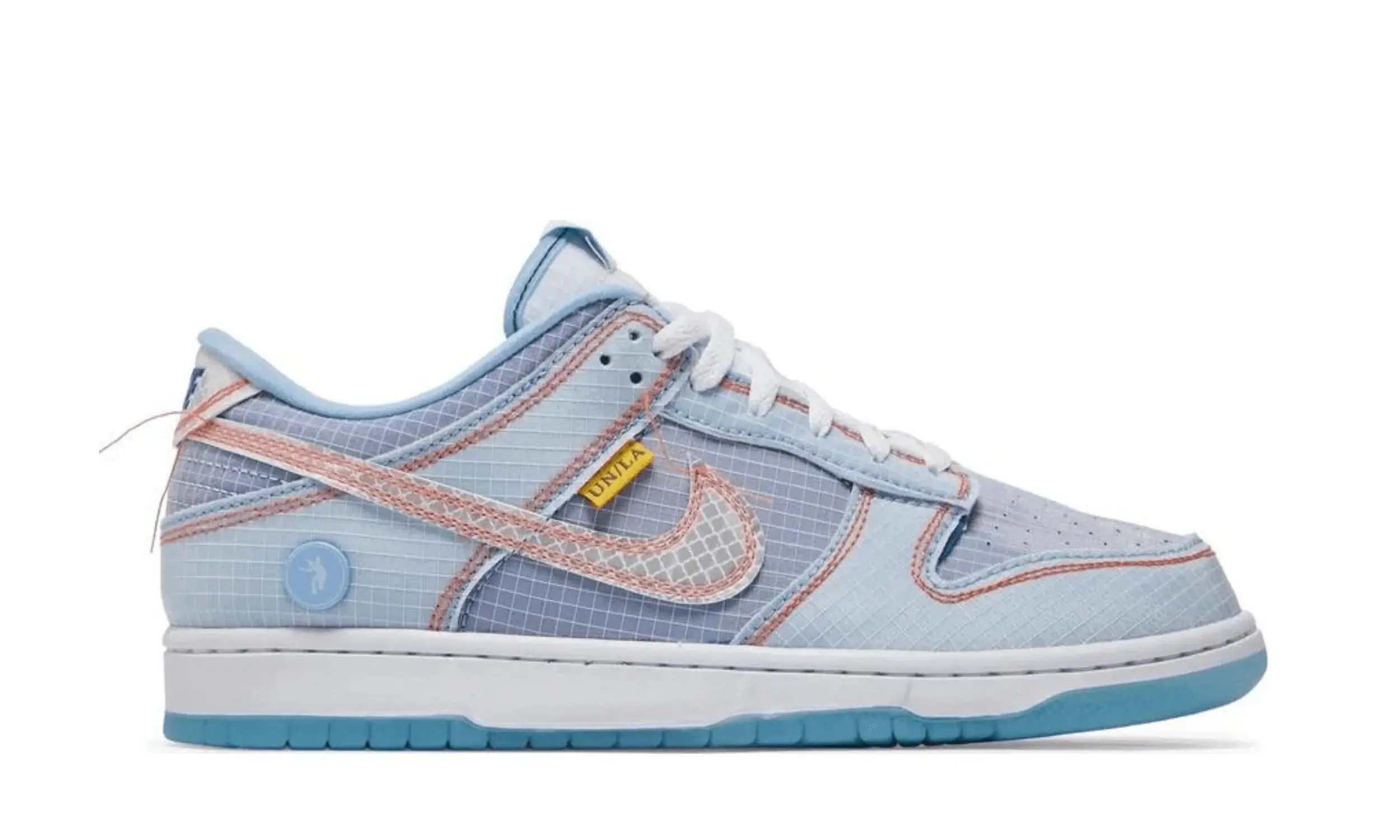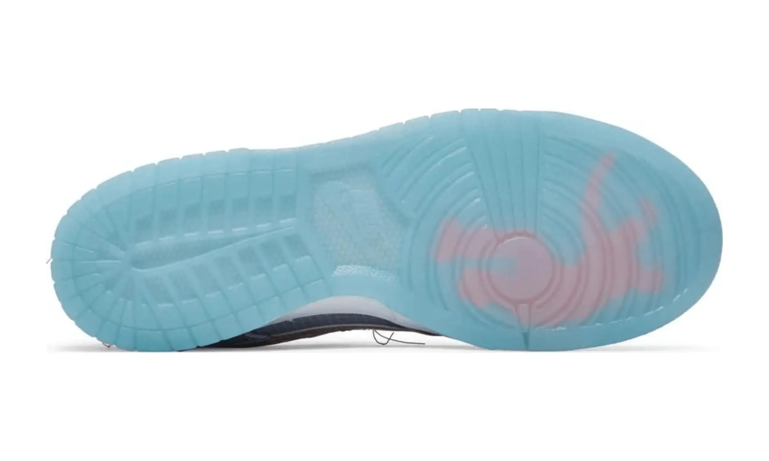 Buty Nike Dunk Low Union Passport Pack Argon osadzono na białej podeszwie środkowej i półprzezroczystej niebieskiej podeszwie zewnętrznej z widocznym logo Union.