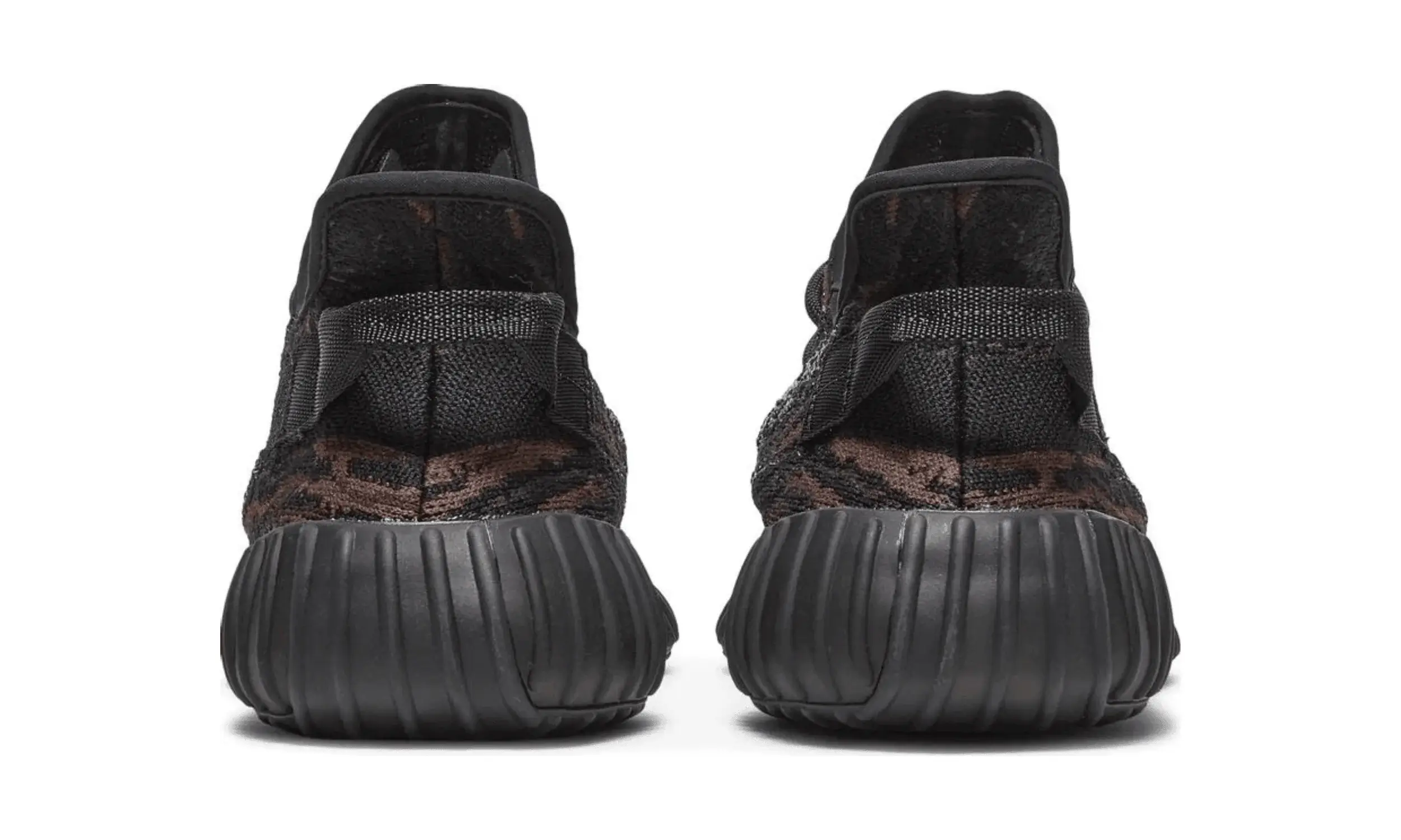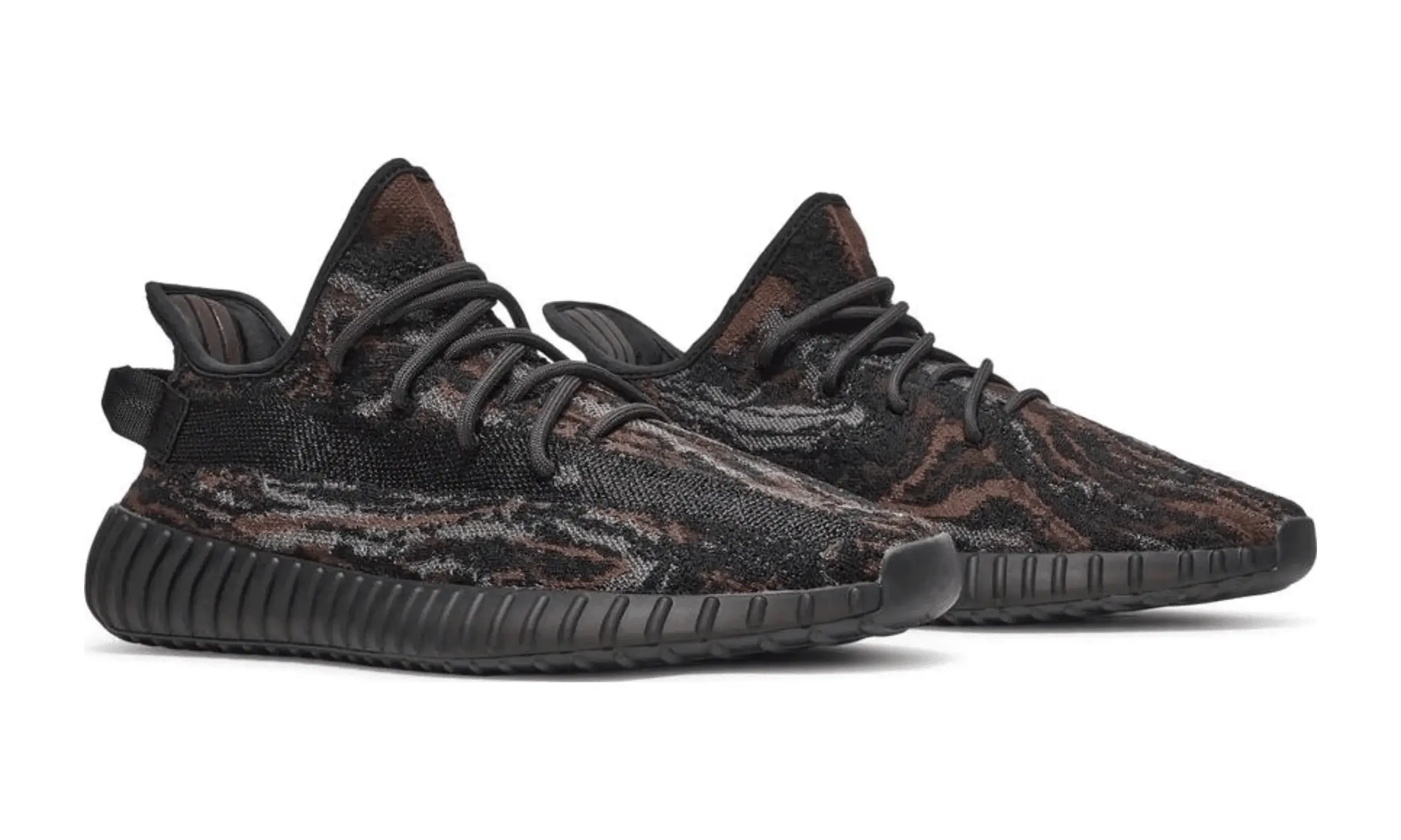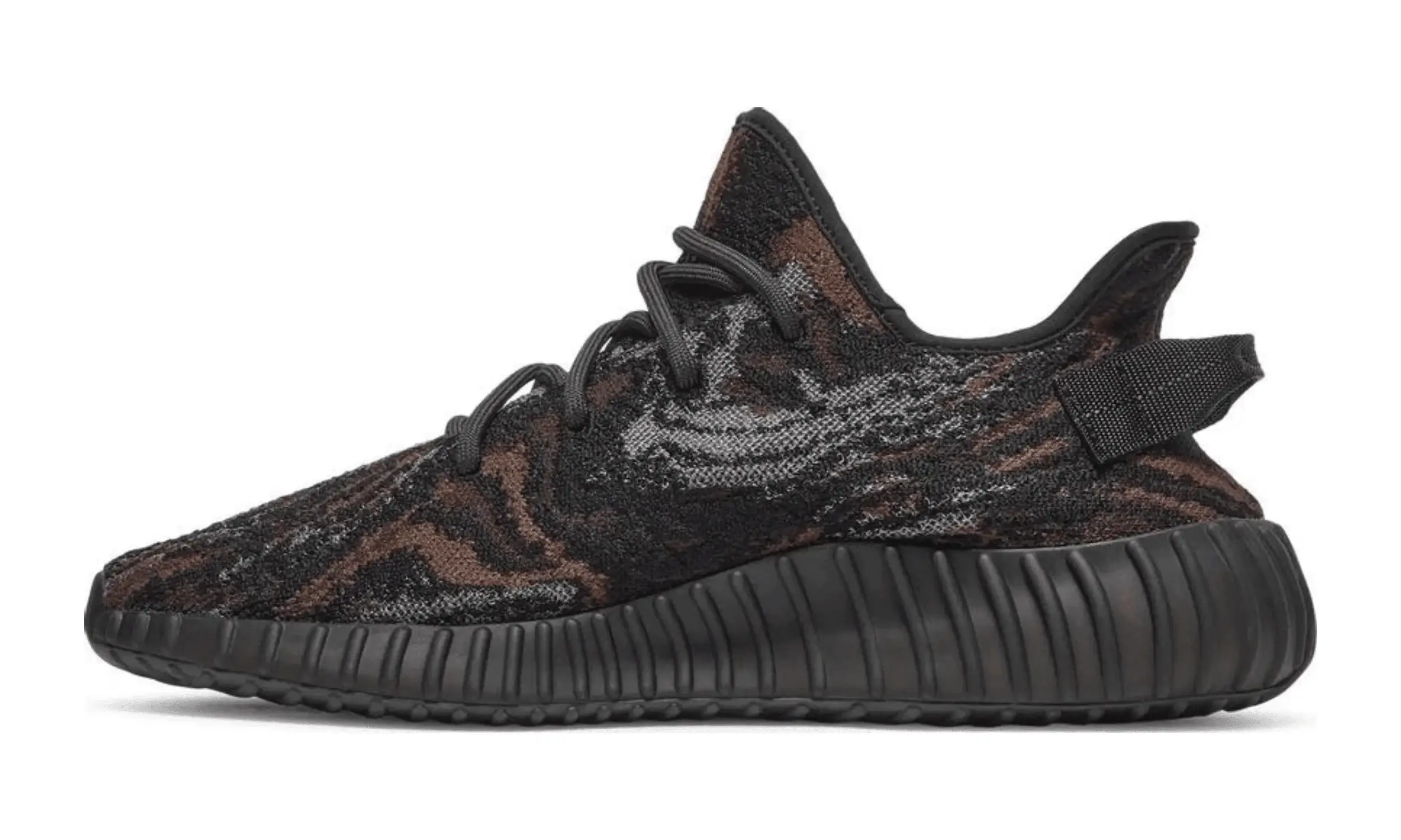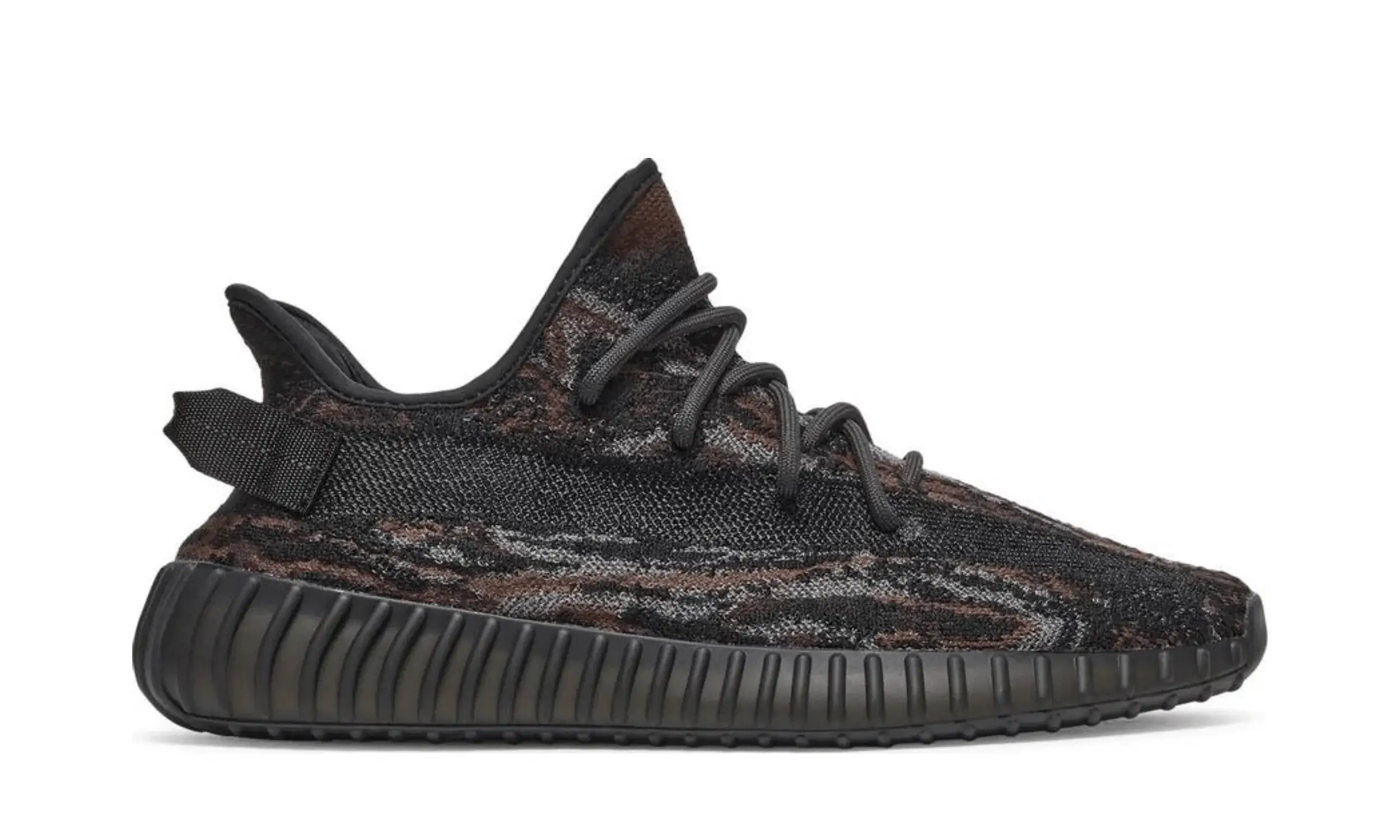 Adidas Yeezy Boost 350 V2 MX Rock prezentuje smugi brązu i szarości w przewiewnej cholewce Primeknit w ciemnym, grafitowym wykończeniu. Przypominająca skarpetę konstrukcja jest wyposażona w tradycyjne koronkowe zapięcie i pasek przymocowany do pięty. Przecinający boczną stronę tenisówki pasek z monofilamentu barwionego po obróbce zapewnia lepszą oddychalność. Lekka amortyzacja jest zapewniona dzięki w pełni zamkniętej podeszwie środkowej Boost, widocznej przez wycięte detale w gumowej podeszwie zewnętrznej.